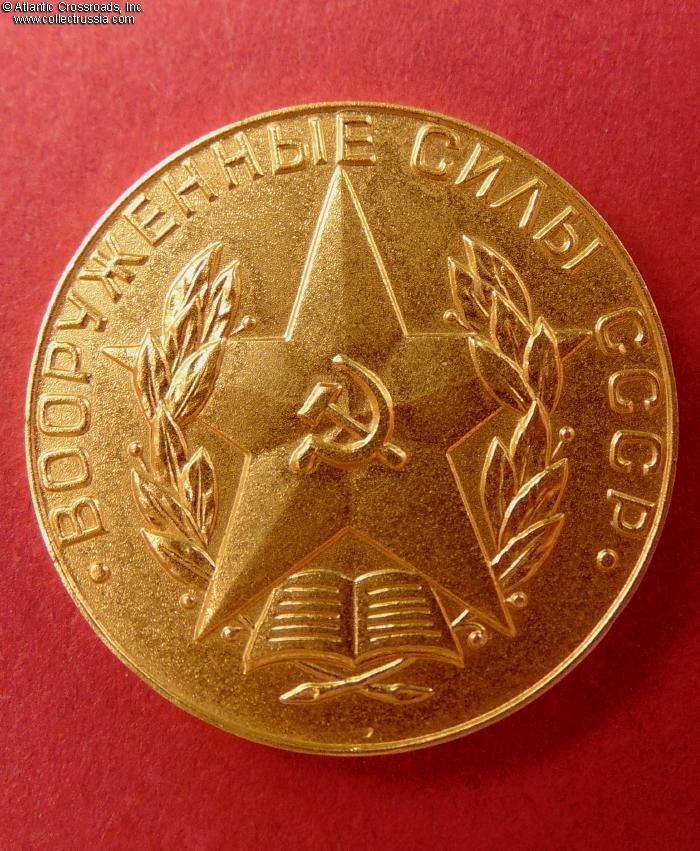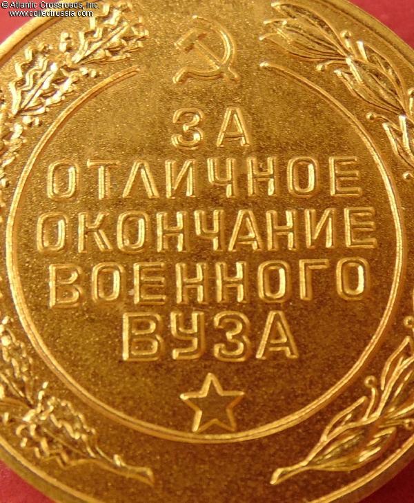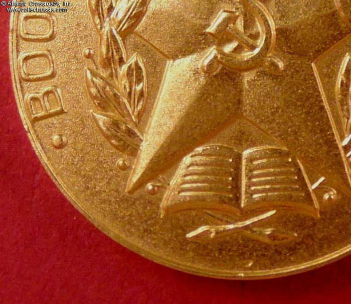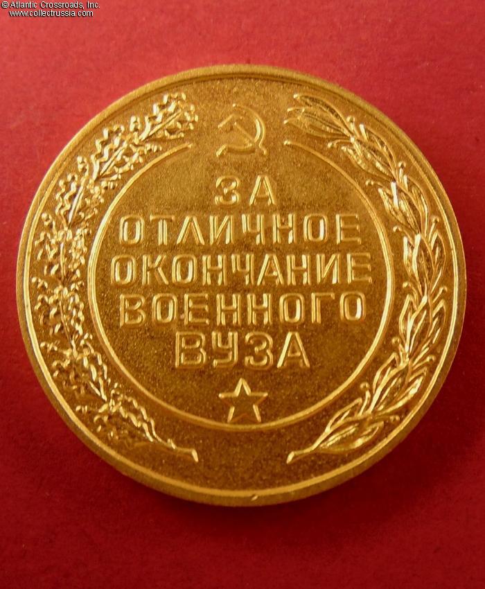 Issued to graduates of higher military colleges and academies for achieving excellent GPA. The gold medal was originally established in 1950; its early versions had the profile of Stalin and the name of the particular school that issued it. In 1959, at the peak of the "de- Stalinization campaign" launched by Khrushchev, it was replaced with a generic gold graduation medal which no longer showed Stalin's portrait or identified the school. /Avers 8 p. 503, fig. 2415 - note that the date of the institution of the "generic" medal shown in the book is incorrect/.