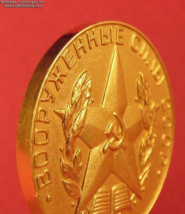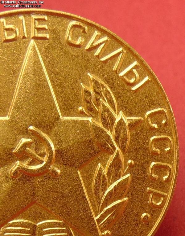 Silver, gold and copper alloy (Soviet "375 gold", equivalent to approx. 9 K gold content) with 23 K gold plating. Measures 26.1 mm diameter, 2.1 mm thick at the edge; weighs 11.0 g. Features the Soviet military emblem of star with hammer & sickle, a book, and a wreath. The raised inscription along the top edge reads "Armed Forces of the USSR". The reverse is inscribed in raised font "For Graduating from a Military Academy with Honors".