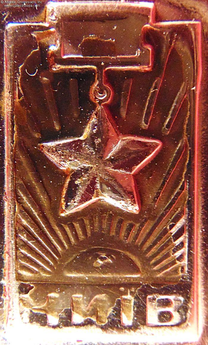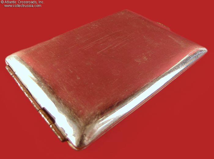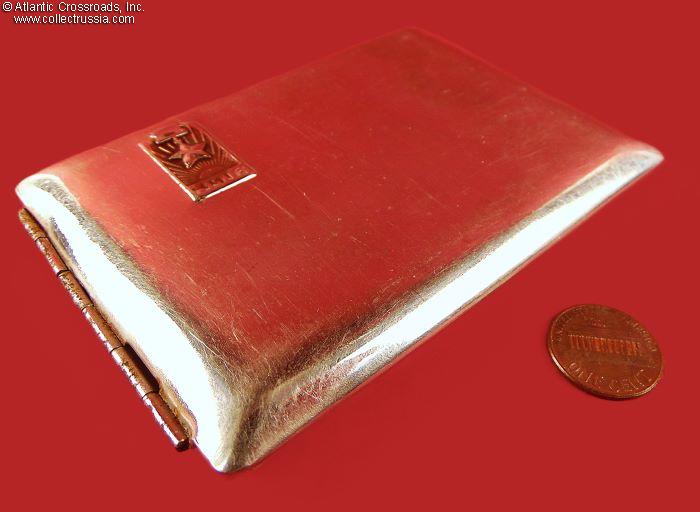 In chromed steel, measures approx. 108 x 78 x 13 mm. The hinge is on the short side. The case features smooth unadorned surface with just one piece of artwork: a small rectangle with the Hero of the Soviet Union star against the background of the rising sun and the name of the city, "КИIВ" underneath, in Ukrainian.