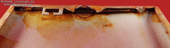 In excellent condition. Very minor rust is all on the inside; the outside surface shows surprisingly little wear, mostly just a few light shallow scratches on the bottom panel. The retainer bands used to hold cigarettes are in place and appear to be