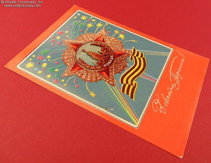 The size is continental standard 6" x 4", postally unused and unmarked, published by the Soviet Ukraine Publishing House in Kiev, circulation 700,000. The lettering under the artwork is in Ukrainian. The artwork features a large detailed image of the Order of Victory. The artist's name, V. Grinko, is printed in the lower left-hand corner on the verso under the title of the postcard captioned in Ukrainian and Russian.