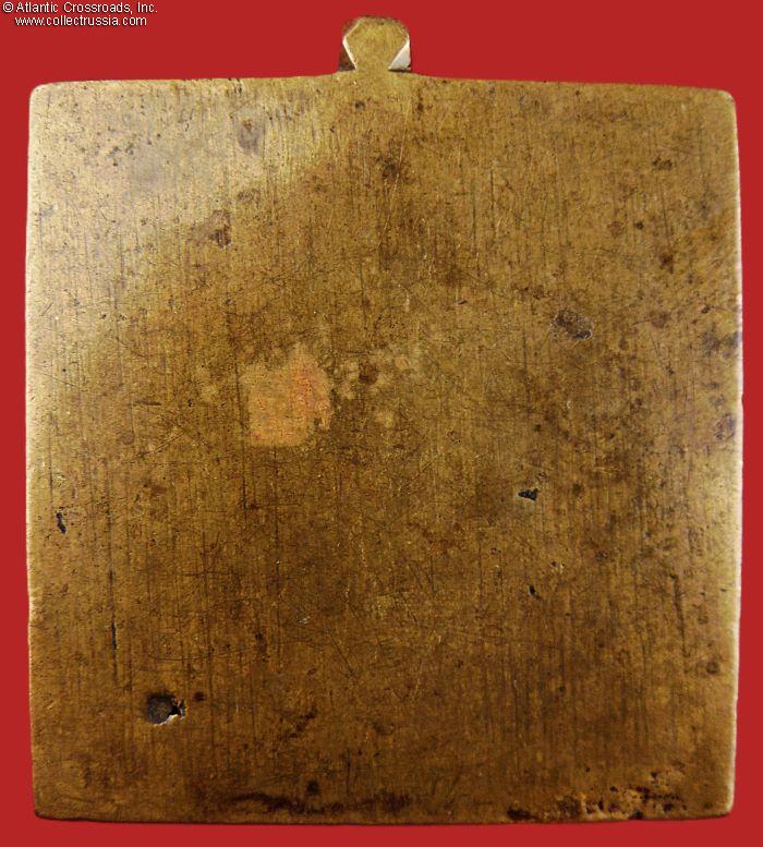 In bronze & enamels, 2 ¼" x 2". The icon depicts Saint Paraskeva, aka Paraskeva Friday. In Russian Orthodox tradition, Paraskeva is considered a virgin martyr who was born to a rich family of Iconium (modern-day Konya in Turkey). Her parents were Christian and gave her the name Paraskeva which in Greek means Friday, the day she was baptized. According to tradition, Paraskeva converted a man named Antoninus to Christianity. She was subsequently martyred at Iconium during the persecutions of Diocletian, the Roman emperor of the late 3rd - early 4th century. Among the Russian Orthodox peasantry, she was venerated as protector of women, marriage, homestead, and farm animals.