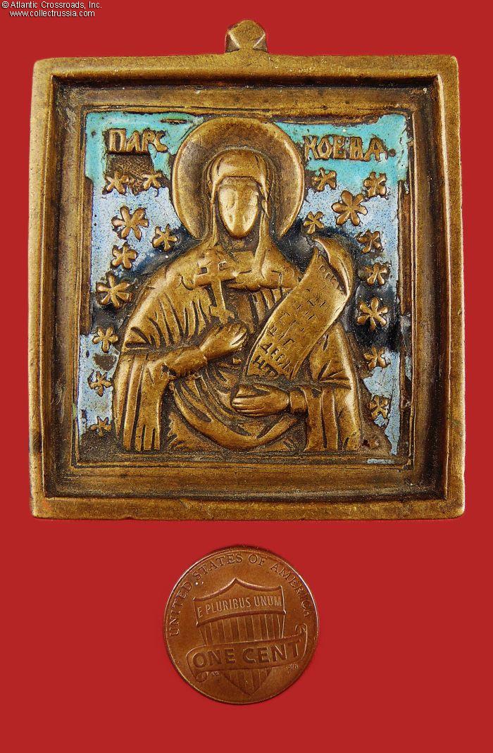 In bronze & enamels, 2 ¼" x 2". The icon depicts Saint Paraskeva, aka Paraskeva Friday. In Russian Orthodox tradition, Paraskeva is considered a virgin martyr who was born to a rich family of Iconium (modern-day Konya in Turkey). Her parents were Christian and gave her the name Paraskeva which in Greek means Friday, the day she was baptized. According to tradition, Paraskeva converted a man named Antoninus to Christianity. She was subsequently martyred at Iconium during the persecutions of Diocletian, the Roman emperor of the late 3rd - early 4th century. Among the Russian Ortho