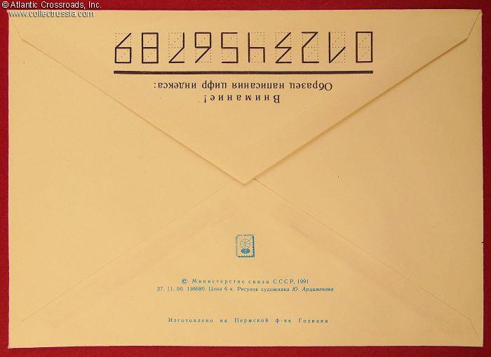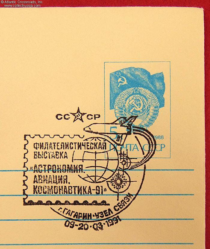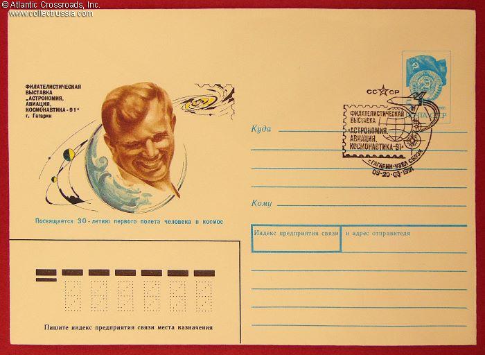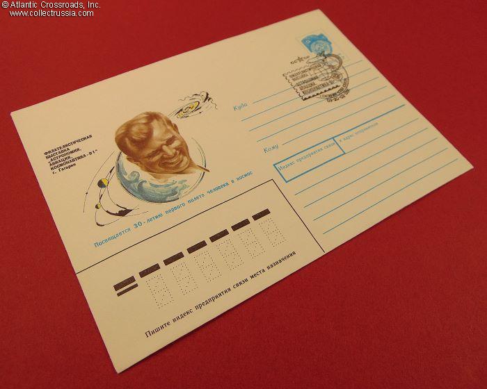 The size is 6 ¼" x 4 ½", postally unused, published by the Ministry of Communications of the USSR, circulation unknown. The pre-printed postal stamp is canceled with the First Day stamp issued by the town of Gagarin, dated 09 - 20 March 1991. The artwork in the left panel of the obverse features a smiling Yuri Gagarin and is captioned with the phrase "dedicated to the 30th anniversary of man's first space flight." The name of the artist, Yu. Artsimenev, is printed on the bottom flap on the verso.