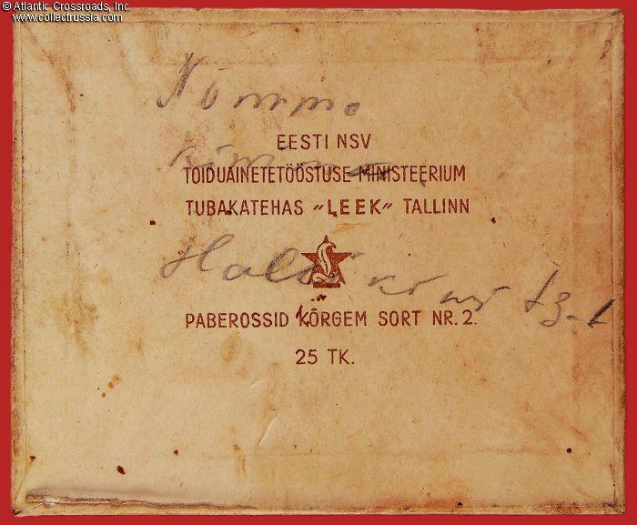 In laminated cardboard, measuring 117 x 98 x 19 mm, manufactured by the "Leek" Tobacco Factory, Tallinn, Estonian SSR; capacity 25 cigarettes. As seen in the picture on the lid, these were the so-called "Russian cigarettes" - filled with tobacco up to about half-length with a long hollow cardboard mouthpiece.