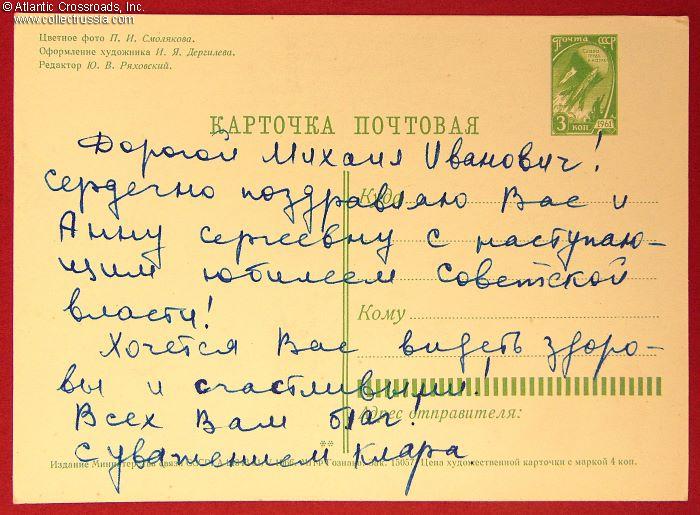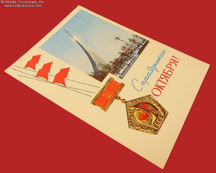 The size is continental 6" x 4", postally unused, with pre-printed postal stamp. Published by the Ministry of Communications of the USSR, circulation unknown. The obverse features the image of the Cosmonaut of the USSR badge, established by the decree of the Presisium of the Supreme Soviet of the USSR in May 1961, and a photo of the Monument to the Conquerors of Space erected in 1964 near the entrance to the Exhibition of Achievements of National Economy fairgrounds in Moscow. The names of the photographer and the artist, P. Smolyakov and I. Dergilev, are printed in the upper left-hand corner on the verso. The inscription on the verso contains well wishes on occasion of the anniversary of the October Revolution.