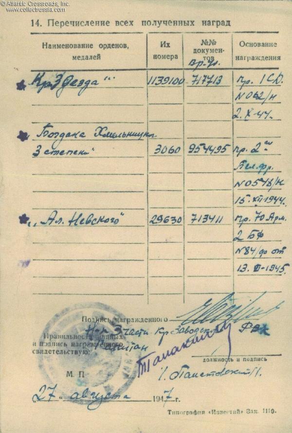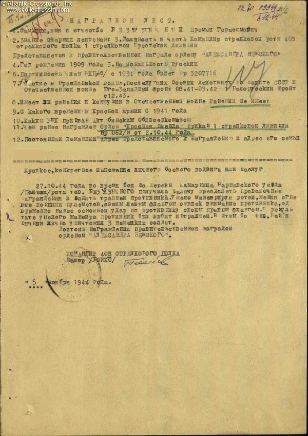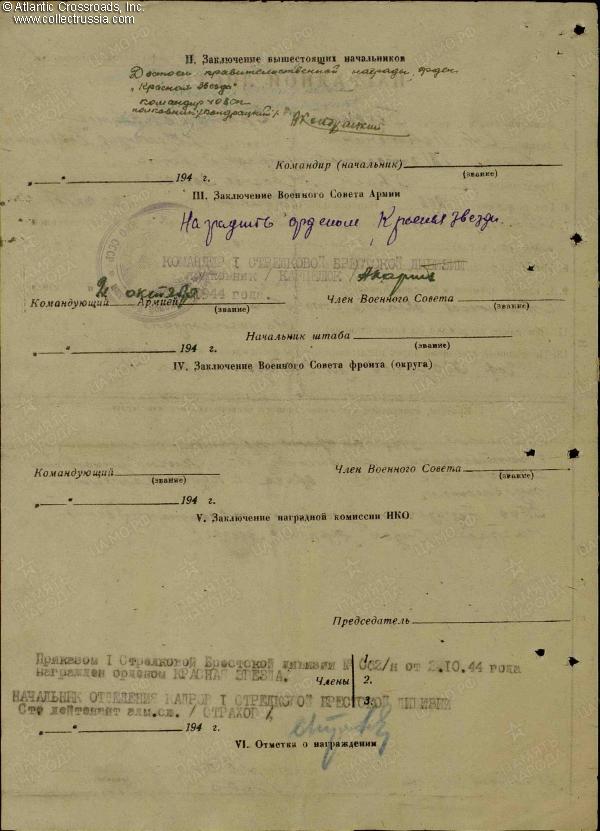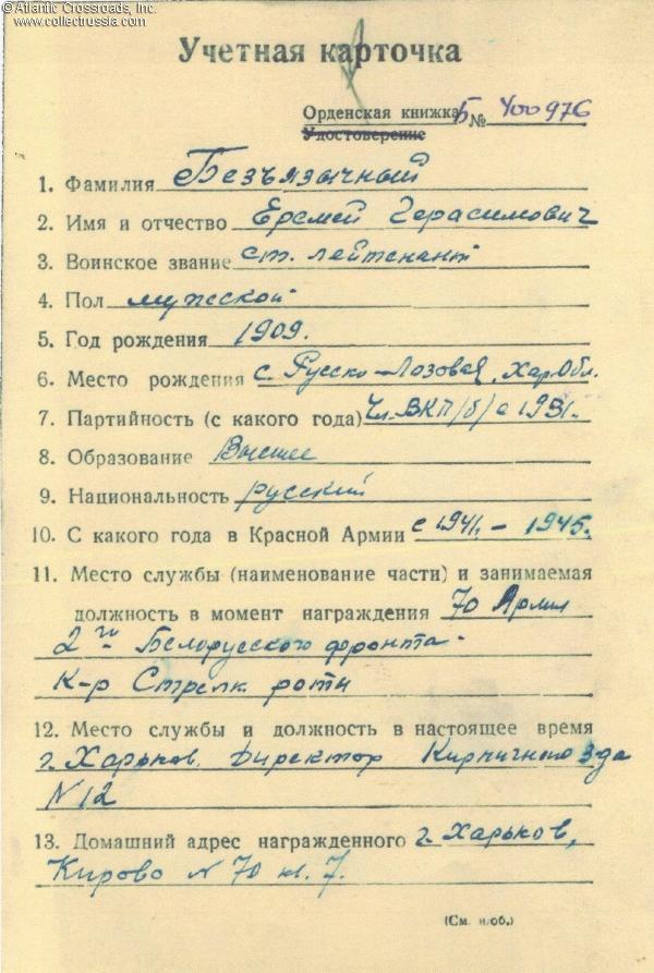 On 21 July - almost exactly a month after the start of the Operation Bagration - Bezyazychnyi took part in an assault on an enemy hilltop position and personally destroyed a self-propelled gun and heavy machine gun. On 2 October 1944, he was decorated for this feat with an Order of the Red Star (#1139100).