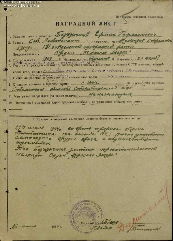 Bezyazychnyi earned his first decoration in July 1944 during the Bagration Offensive in Belorussia. At the time already a senior lieutenant, he commanded a platoon of a Penal Company of the 1st Rifle Division, 70th Army, 2nd Belorussian Front - an unenviable command position in what was essentially a suicide unit, one of many such punishment companies made out of convicted criminals and deserters. (These were quite different from penal battalions that were mostly composed of former officers who got court-martialed and given a chance to redeem themselves. Unlike penal companies, the battalions typically enjoyed good morale, often had decent equipment and weapons, and were even considered something of an elite assault force. The far more numerous penal companies, on the other hand, were treated as nothing more than cannon fodder and were typically sent to die in human wave attacks.)