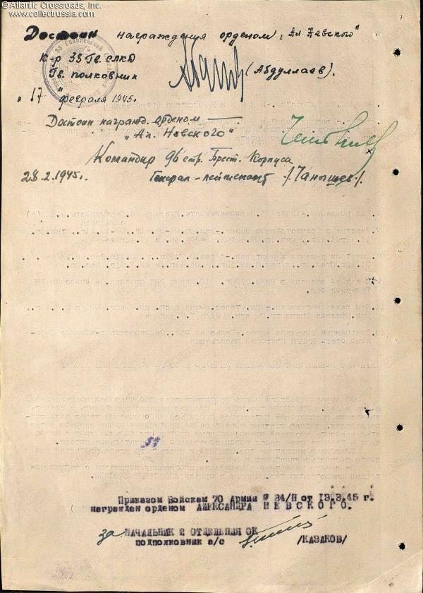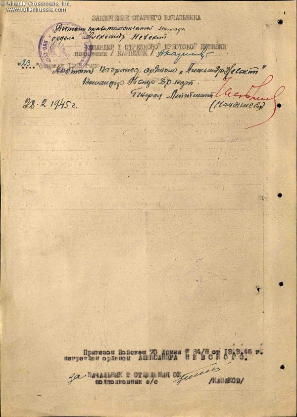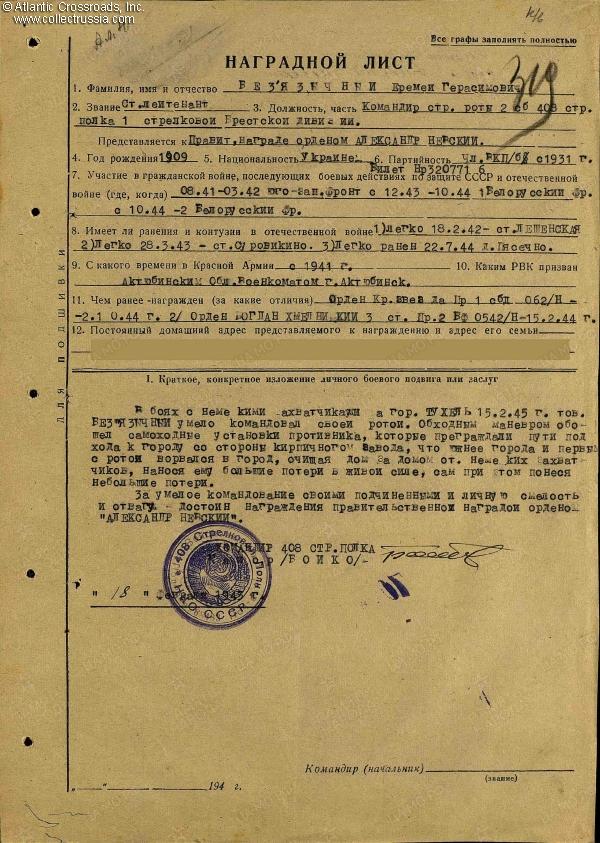 Bezyazychnyi earned the Order of Alexander Nevsky, his last decoration of the war, in northern Germany during the Eastern Pomeranian offensive. On 15 February, he maneuvered his company around the enemy assault guns protecting the southern approaches to the town of Tuchel (now Tuchola, Poland) southwest of Danzig. He and his company were the first to break into the town clearing its buildings one by one of the entrenched German troops. In this skirmish Bezyazychnyi inflicted significant losses on the enemy while suffering few casualties among his own men - a textbook requirement for the Order of Alexander Nevsky, which was awarded to him on 13 March 1945 (#29630). He was wounded in combat in May 1945 at the very end of the war and retired from the military soon thereafter following a convalescence in a military hospital. As of August 1947, he resided in Kharkov where he worked as a director of a brick factory.