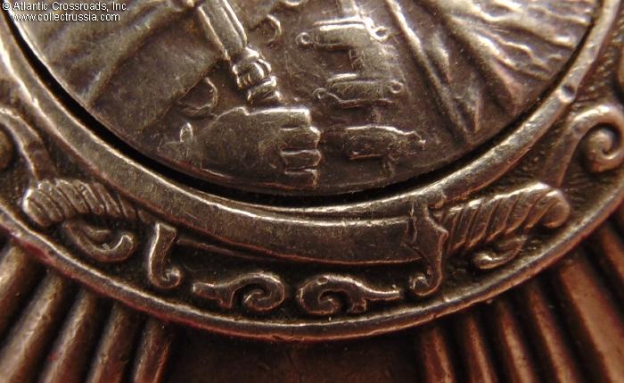 Very fine to excellent condition. There is a small dent to the recessed background of the center medallion to the left of Khmelnitsky's head, which is not too detractive. This is really the only noticeable flaw of this otherwise beautifully preserved piece. In particular, the raised details of the bas-relief portrait show no significant wear and are extremely crisp, nearly pristine. The arms of the star and rays of the starburst have only some minuscule contact marks, no significant scratches or edge knocks.