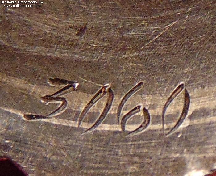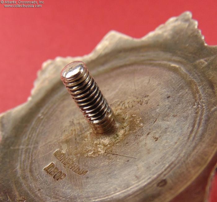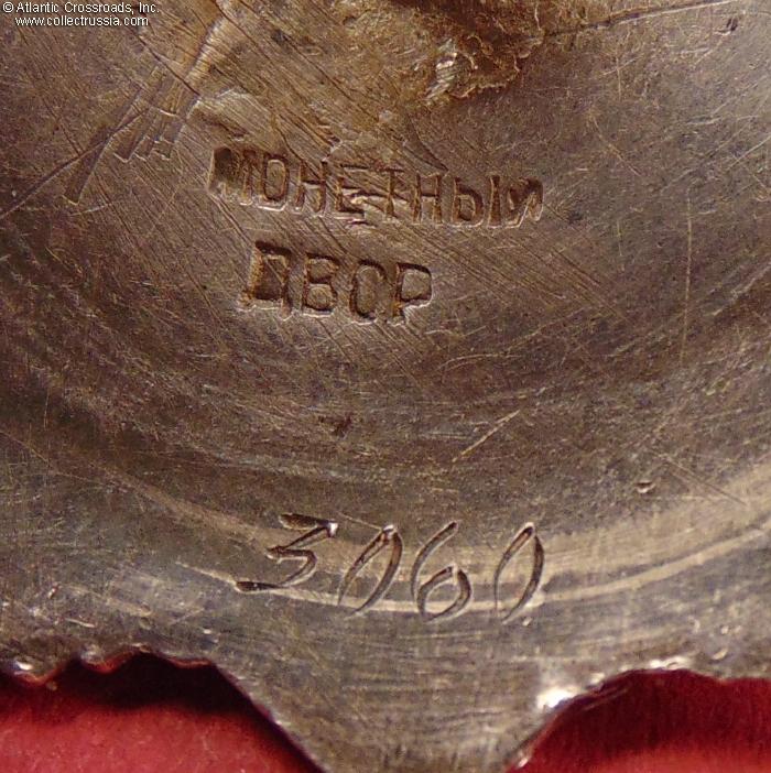 In silver; measures 44.9 mm in height, 43.2 mm in width; weighs 30.3 g without the screw plate. Type 1, featuring a separate, soldered center medallion. The right saber does not have a dot on the blade near the hilt found on other variations. The reverse has a small stamped maker mark "1" approximately halfway between the edge and screw post at 8 o'clock position. The serial number is engraved in the standard manner at 6 o'clock.