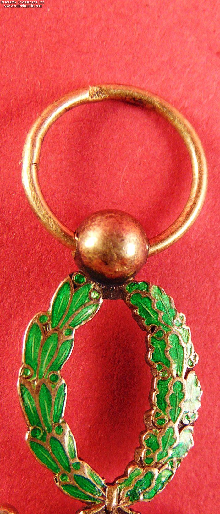 In very fine condition. The obverse shows minor loss of green enamel to the 5, 7, and 8 o'clock tips of the cross arms. The reverse shows similar minor loss of green enamel to the 3, 4, 7 and 10 o'clock tips.