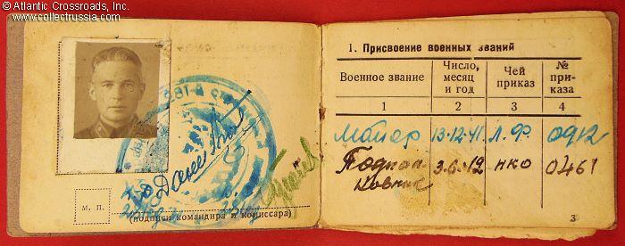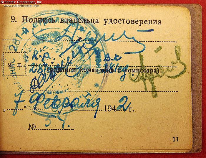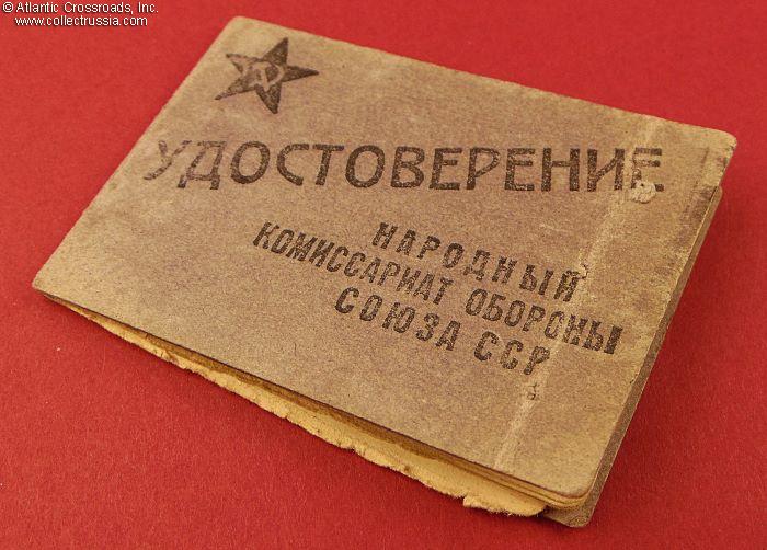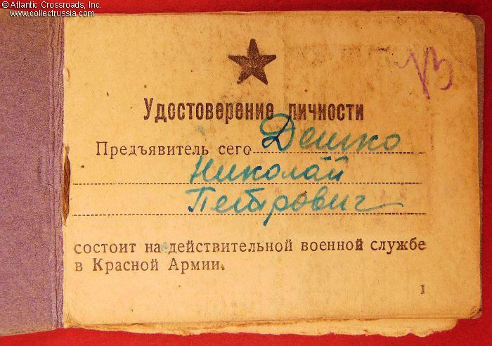 In booklet format measuring 3" x 2", in plain cardboard cover. The wording on the front cover reads "CERTIFICATE, People's Commissariat of Defense of the Union of SSR." According to the ID, Deshko was born in 1901. It should be noted that this ID was issued about a week after the 281st Rifle Division had been withdrawn for refitting, depleted after almost three weeks of continuous combat near the village of Pogostye about 50 miles southeast of Leningrad, an early and unsuccessful counteroffensive attempt to relieve the besieged Leningrad.