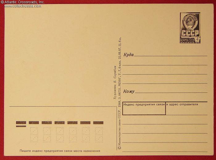 The size is continental standard 6" x 4", with a pre-printed postal stamp; postally unused and unmarked. Published by the Ministry of Communications of the USSR, circulation 7.4 million.
