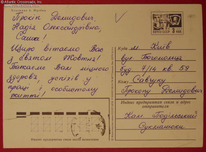 The size is continental standard 6" x 4", with a pre-printed postal stamp. Postally used but the cancel is too faint to determine the location. The obverse features famous Leningrad landmarks. The inscription on the verso is in Ukrainian language and contains well wishes on occasion of the anniversary of the October Revolution.