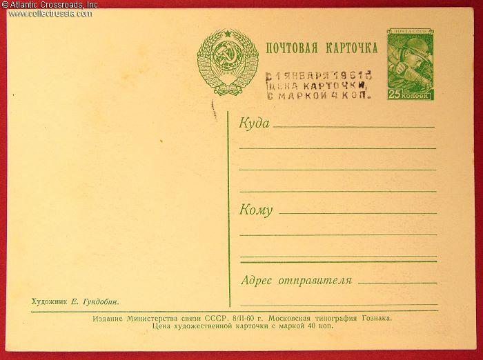 The size is continental standard 6" x 4", with a pre-printed postal stamp. Postally unused. Published by the Ministry of Communications of the USSR, circulation unknown. The black ink stamp on the verso informs of the new price of the postcard starting on 1 January 1961, the date of Khrushchev's currency reform.