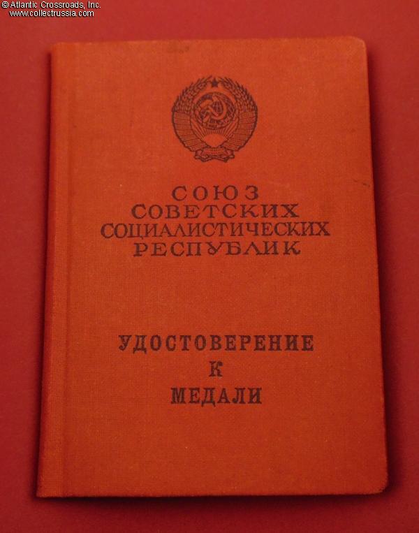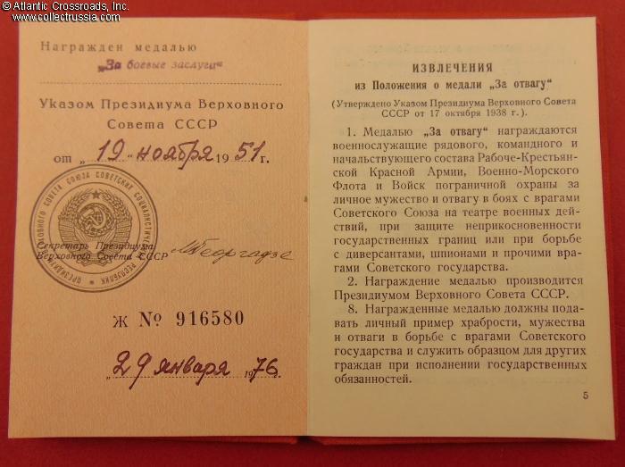 The certificate is a hard 10.5 x 7.5 cm booklet wrapped in red cloth, similar to an order booklet. It was filled-out on 29 January 1976 and shows no other awards. Note an uncommonly late date of issue of the document, 24 years after the award decree. There is an ink stamp "valid without a photograph" in the space provided for the photo.