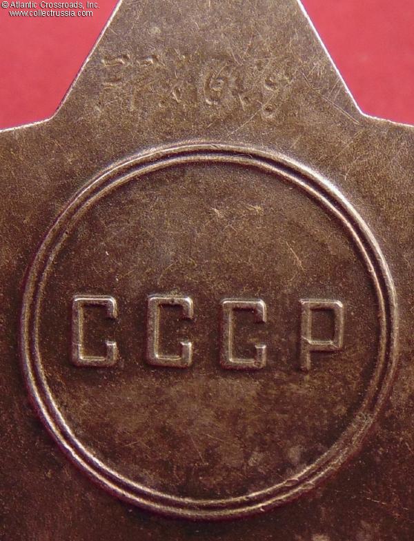 Silver, enamels; 48.2 mm in height incl. eyelet, 46.0 mm in width; weighs 20.8 g not including the suspension and connecting link. Late variation featuring rotating tool-engraved serial number. Classified as Variation 10 Sub-Variation 2 by Mondvor.narod.ru, this version features concentric circles on the reverse that are of approximately equal thickness. Unlike some earlier variations, the outer corners of the letters "CCCP" on the reverse are slightly rounded, not beveled. The currently known serial number range for this sub-variation is 755495 - 813370.