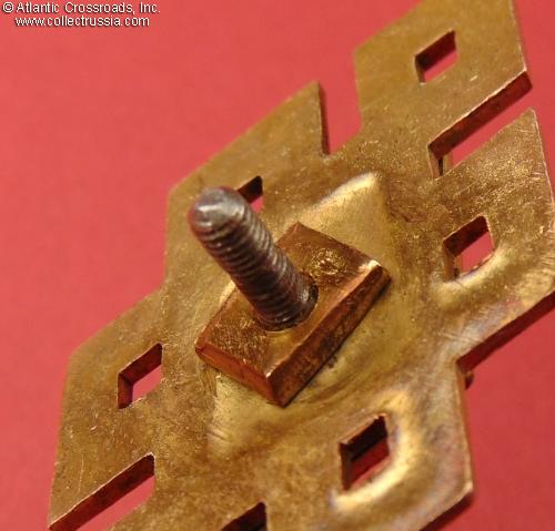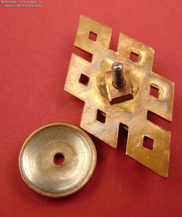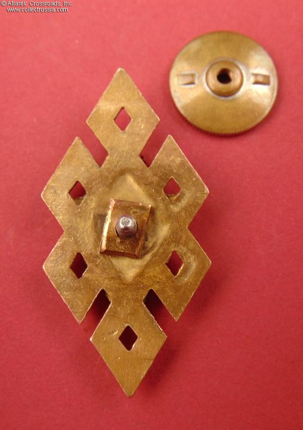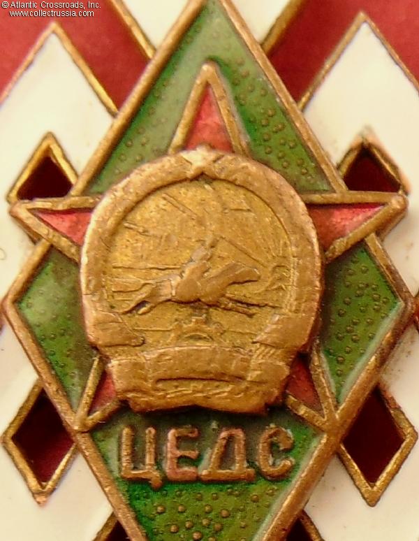 In brass and "cold" enamels, 50.2 x 25.6 mm; three-piece construction. There is a Cyrillic abbreviation ЦЕДС ("TsEDS") under the national emblem. Unlike the civilian college graduation "diamonds", this piece features a red star behind the state emblem.