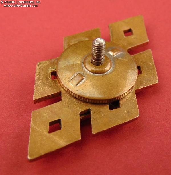 Excellent condition. There is a minor amount of wear to the high points of the central emblem, but its details are still well-defined. The enamel is perfect. The screw post is full length, over 8.5 mm measured from the square retaining nut. Includes unmarked screw plate which is of the period and probably o