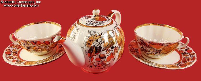 Hand-Painted Tea Service for 2 Persons Autumn Leaves, by LFZ (ЛФЗ), marked for export, 5 pieces, 1972-86.