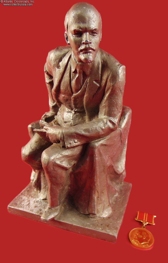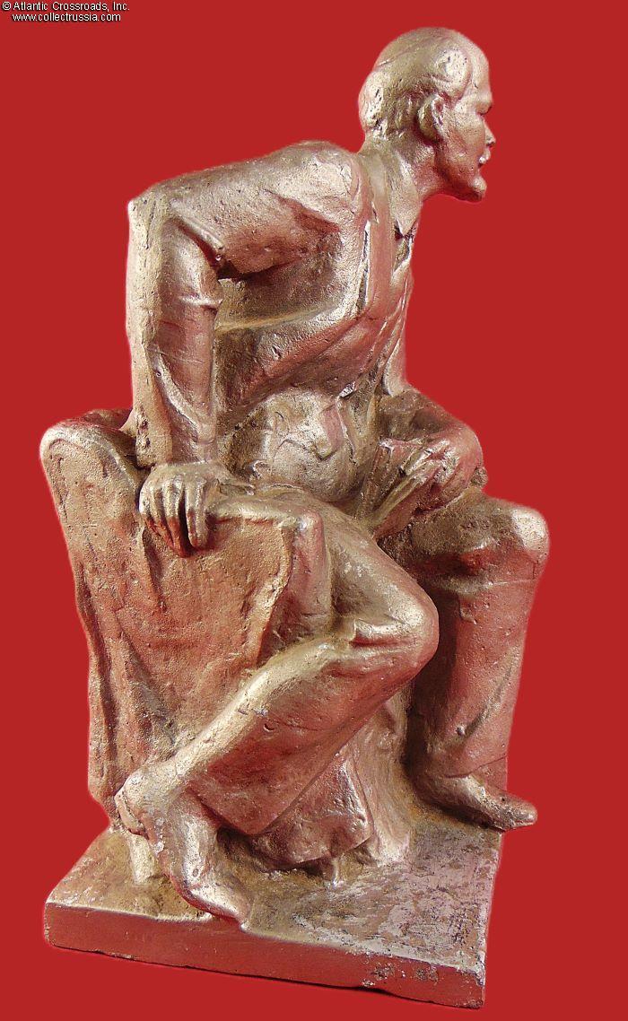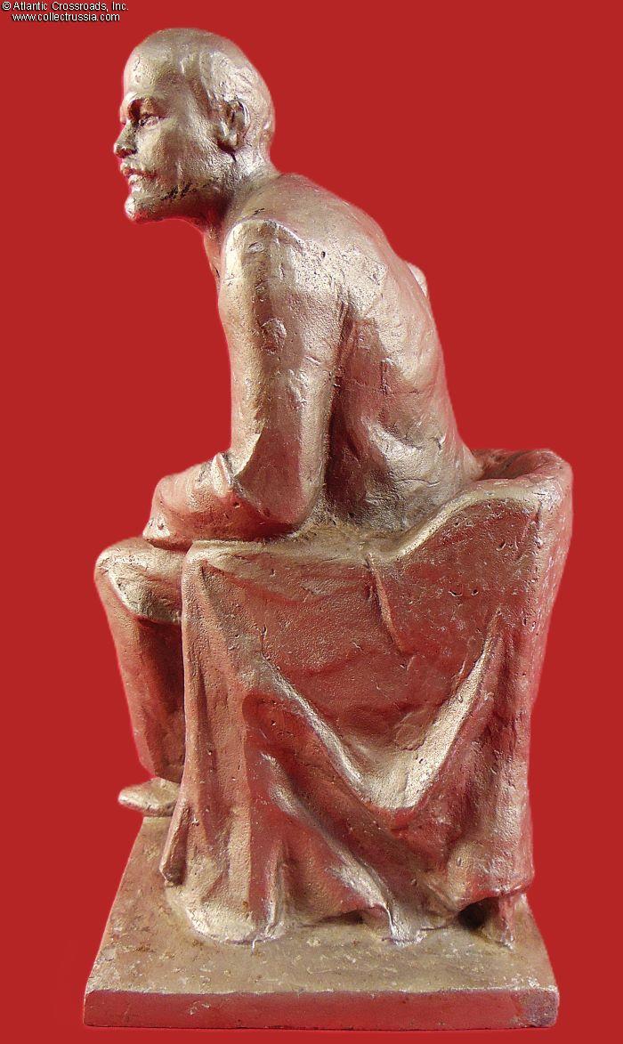 Lenin is depicted here in a very uncommon tense posture. He apparently had just had a eureka moment while reading a book and is now ready to jump out of his chair to turn this new idea into reality (this does not bode well first for the bourgeoisie and eventually to the entire population of the country). The cloth-covered chair suggests that the location is the Smolny Institute in Petrograd while it was the Bolsheviks' headquarters during the October Revolution.