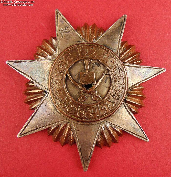 In silver and bronze, 65.6 mm in height, 66.0 mm in width, weighs 63.3 g. The center medallion with Karakul hat and crossed sabers is encircled by an inscription in Arabic. The top ray of the star displays the numeral "4" in Arabic, denoting the class of the award. The reverse is plain, with a horizontal suspension bar.