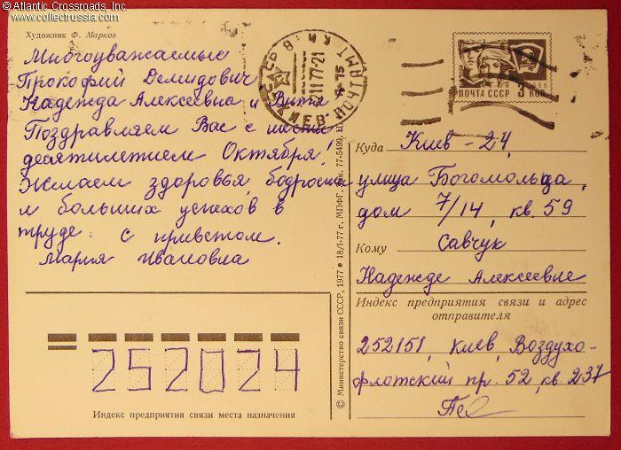 The size is continental standard 6" x 4", with a pre-printed postal stamp canceled by the stamp of a Kiev Post Office branch. Published by the Ministry of Communications of the USSR, circulation unknown. The inscription on the verso contains well wishes on occasion of the anniversary of the October Revolution.