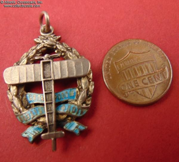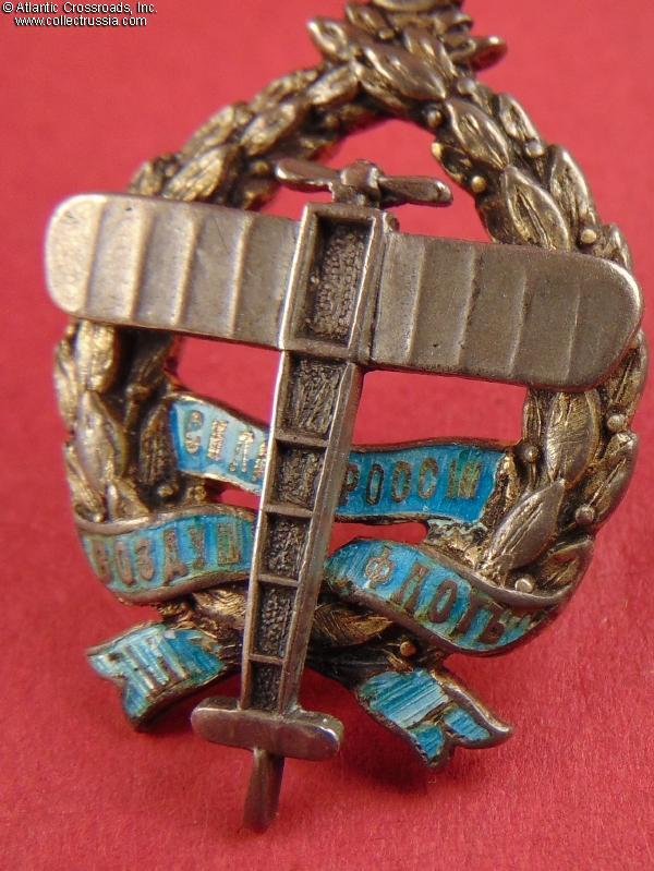 Silver Gilt, Enamel; measures 34.7 mm in height (incl. the eyelet), 22.7 mm in width; weighs 9.2 g not including the connecting loop. The obverse is an overhead view of an early airplane in silver suspended above a silver gilt laurel wreath. The wreath is bound at the bottom with a sky-blue enameled ribbon. The lettering on it reads: "The Strength of Russia is in Her Air Fleet". Reverse of the wreath is as finely detailed as the obverse but the ribbon is not enameled. The ends of the ribbon bear three hallmarks. One is oval with a Kokoshnik lady's head, an "84" silver grade, and