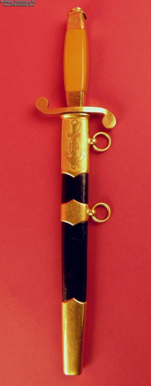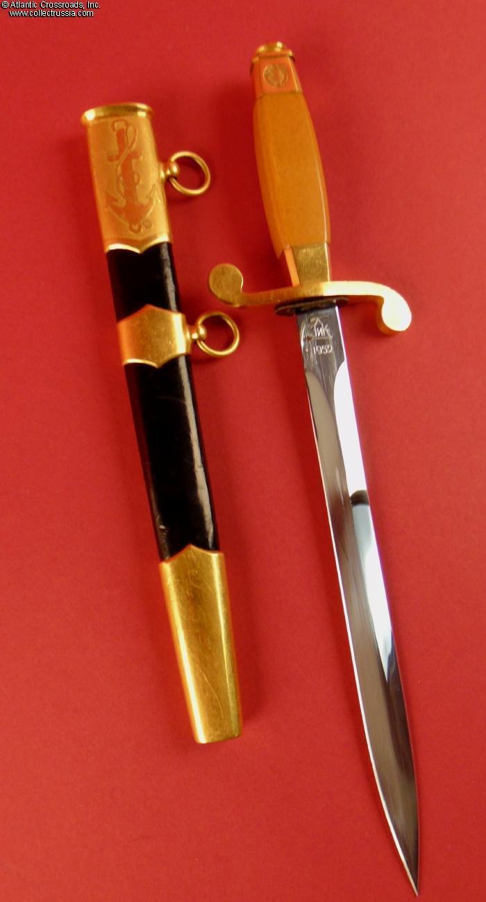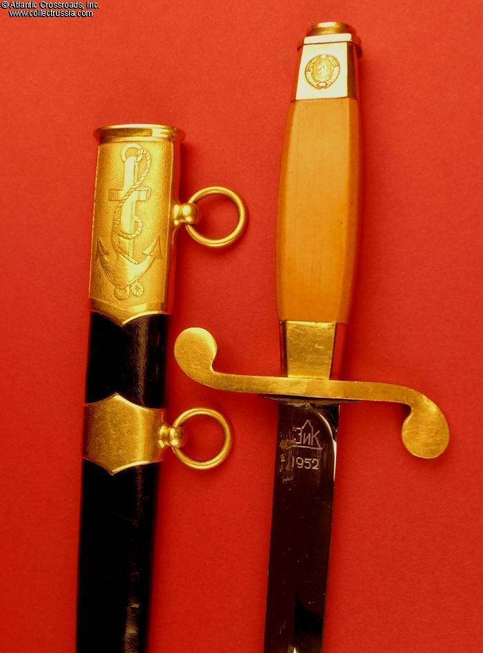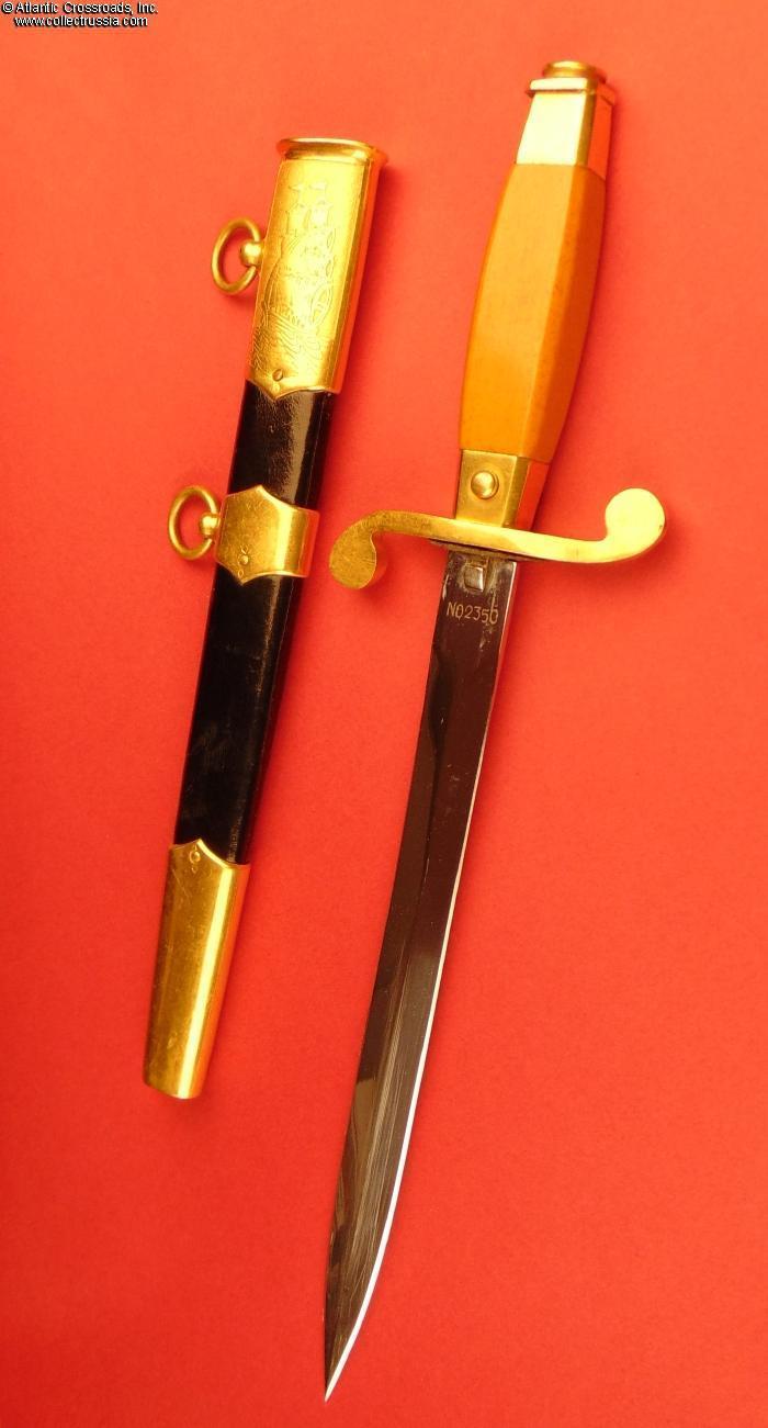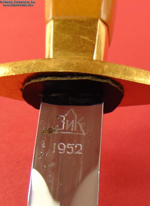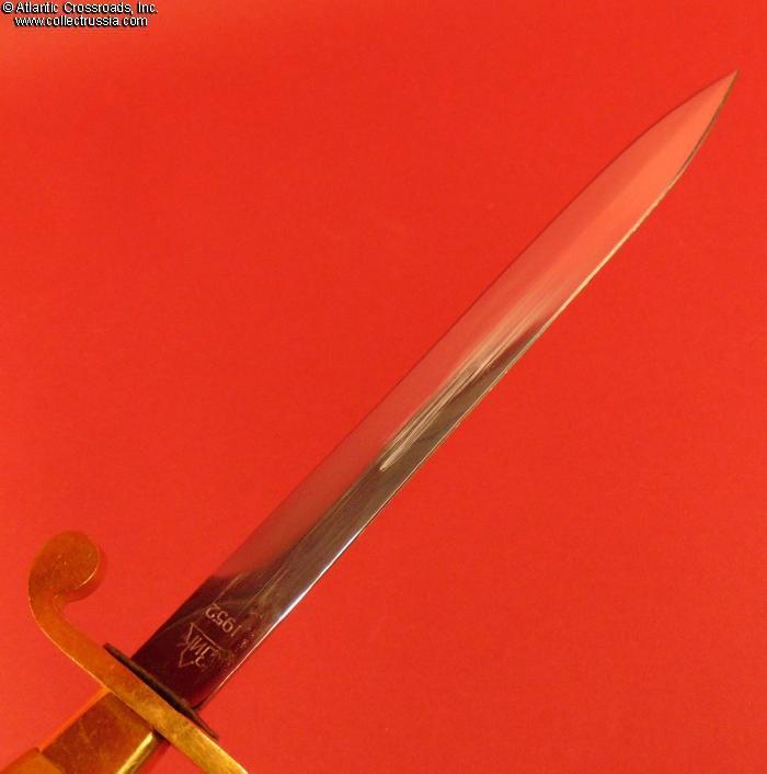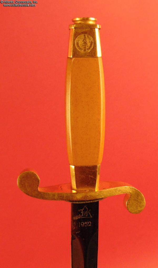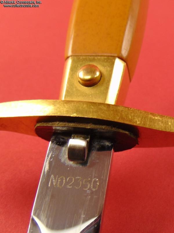 Maker-marked "ZIK" on the ricasso; on the other side of the blade has engraved alphanumeric serial number "N02350". The pommel displays the appropriate Soviet State emblem of the 1946-56 style, with 16 scrolls representing the number of republics in the Soviet Union. The beautiful quality is typical of Soviet daggers produced in the early part of the 50s; note in particular the nice gold plating on the brass parts. The handle grip is in a very attractive lightly speckled medium-toned Bakelite. The dagger measures approx. 13.5" (34 cm) when in scabbard. There are diamond-shaped m