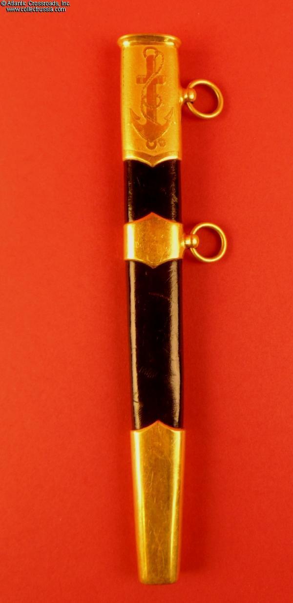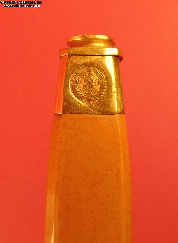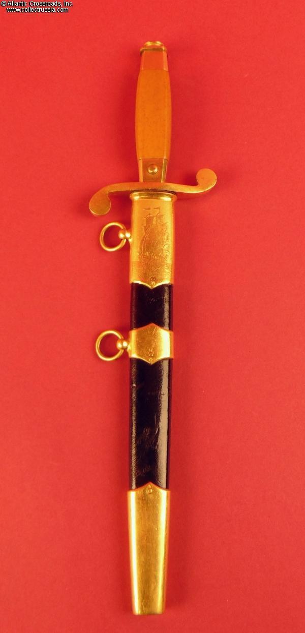 Maker-marked "ZIK" on the ricasso; on the other side of the blade has engraved alphanumeric serial number "N02350". The pommel displays the appropriate Soviet State emblem of the 1946-56 style, with 16 scrolls representing the number of republics in the Soviet Union. The beautiful quality is typical of Soviet daggers produced in the early part of the 50s; note in particular the nice gold plating on the brass parts. The handle grip is in a very attractive lightly speckled medium-toned Bakelite. The dagger measures approx. 13.5" (34 cm) when in scabbard. There are diamond-shaped maker marks stamped near the rivets of the scabbard; a matching maker mark is also stamped onto the leather on the same side under the upper fitting.