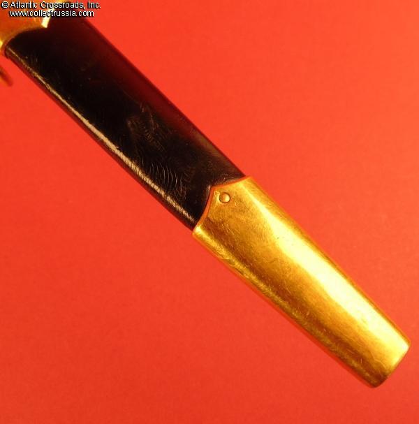 In outstanding, excellent condition. The scabbard leather is completely free of scuffs and or any other significant wear and has only a few light indentation marks; it fully retains its original beautiful "healthy" sheen. The factory-sharpened brilliant blade is almost pristine: it has only a single tiny oxidation spot and a very minor, barely noticeable amount of pitting in a small area on the throat near the maker's mark; the in-and-out wear is almost non-existent; the blade is completely free of the usual nicks to the cutting edge, scratches, or significant rust. The gold finish on all the brass parts is very bright and essentially perfect. Overall, it is a superb Stalin-era example: very uncommon to find with such an early issue date and in such a nice condition.