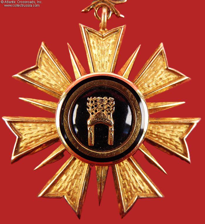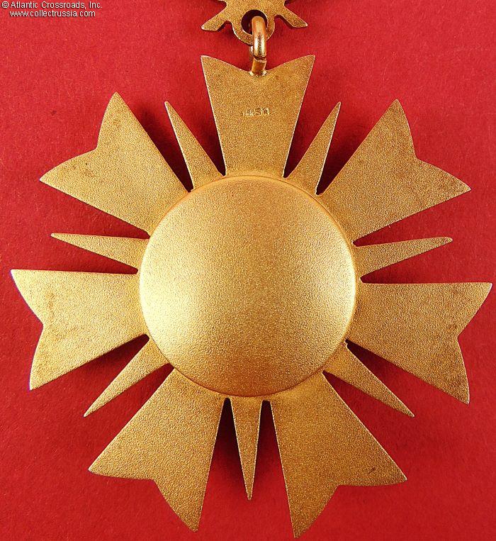 Silver gilt and enamels, 47.4 mm in height (incl. eyelet), 43.4 mm in width. The star and wreath suspension is 27.2 mm in height (incl. eyelet), 23.2 mm in width. Total weight including the suspension is 30.6 g, 25.4 g without. Maker marked on the top arm on the reverse. The threaded ribbon is 36 mm long, with a pinback.