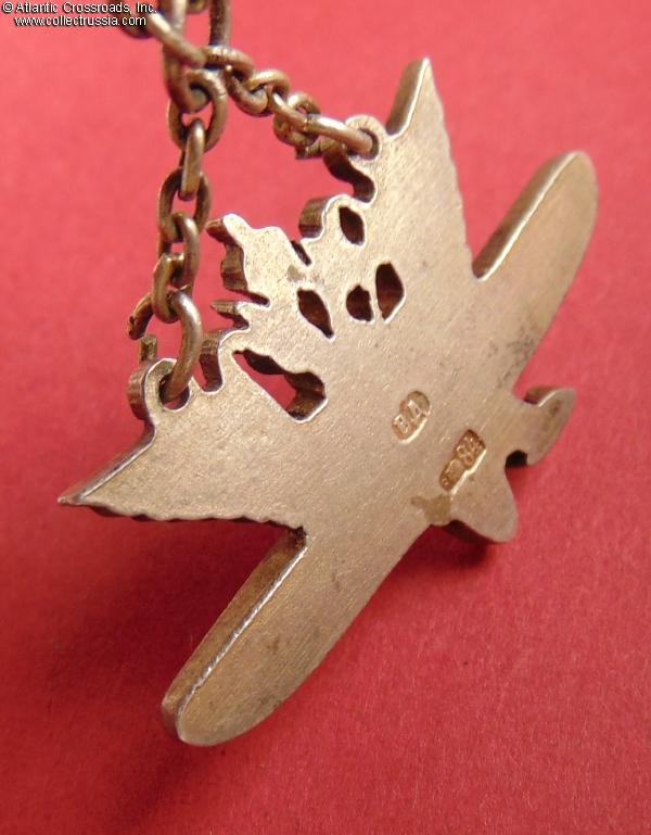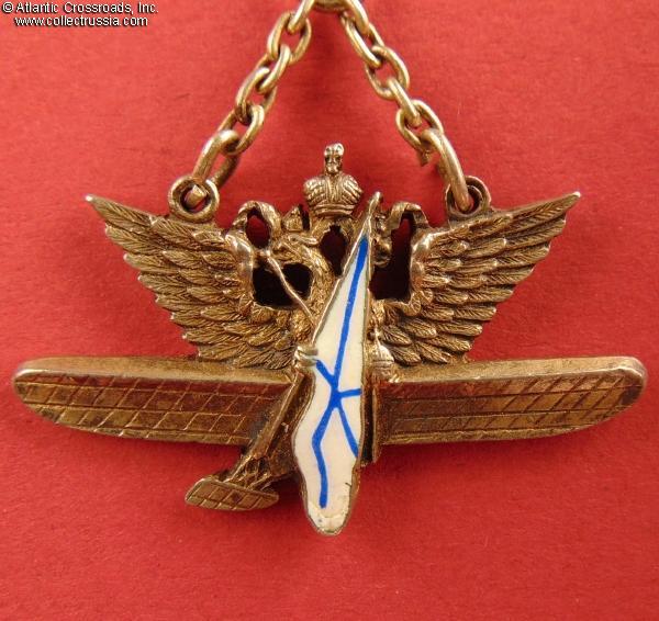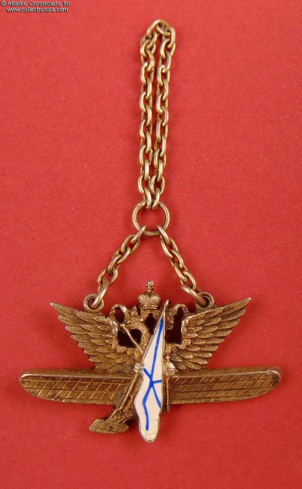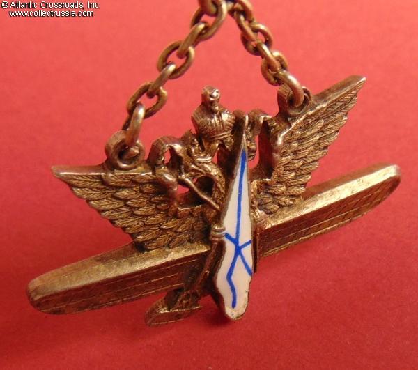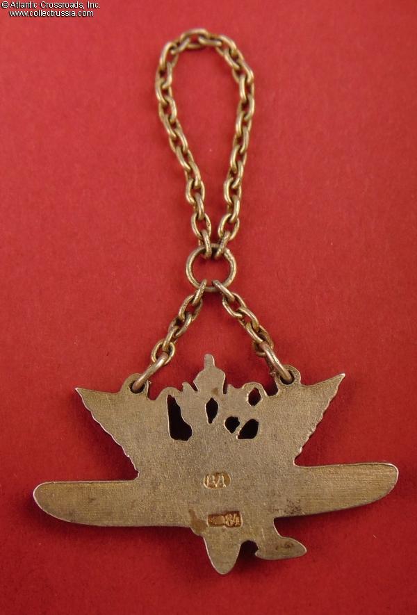 This version of the Air Force donation jetton has long chains specifically to be worn hooked over a suit or uniform button. The artwork features the imperial eagle lifting an early monoplane and flag into the sky. The flag may seem like a regular Russian St. Andrew's naval flag at first glance but it has an interesting feature: an additional short vertical blue line symbolizing the fifth, i.e. "aerial ocean". There are two hallmarks on the reverse: a "Kokoshnik" lady's head "84" silver hallmark with Greek letter Alpha, the designation of the St. Petersburg assay inspection; and Cyrillic letters BД ("VD") of the Eduard jewelry firm (the initials stand for Vera Dietwald, the widow of the original owner of the firm).