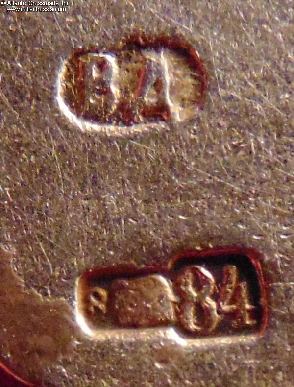 This version of the Air Force donation jetton has long chains specifically to be worn hooked over a suit or uniform button. The artwork features the imperial eagle lifting an early monoplane and flag into the sky. The flag may seem like a regular Russian St. Andrew's naval flag at first glance but it has an interesting feature: an additional short vertical blue line symbolizing the fifth, i.e. "aerial ocean". There are two hallmarks o