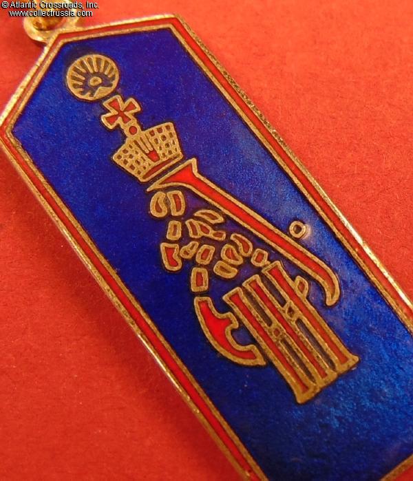 White metal (possibly silver-plated brass), enamels. Measures 33.8 mm in height including the eyelet, 12.9 mm in width; weighs 4.0 g without the connecting links. The reverse is blank. The enamelwork is of very high quality, and the details of the Alexander III's cypher are very precise despite the small size of the jetton.