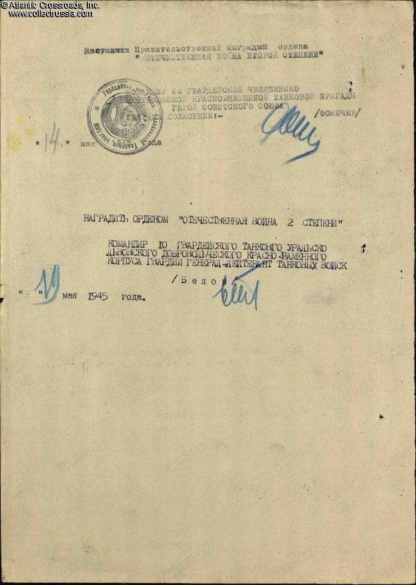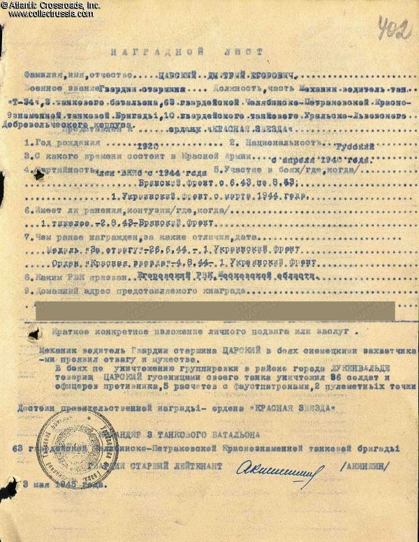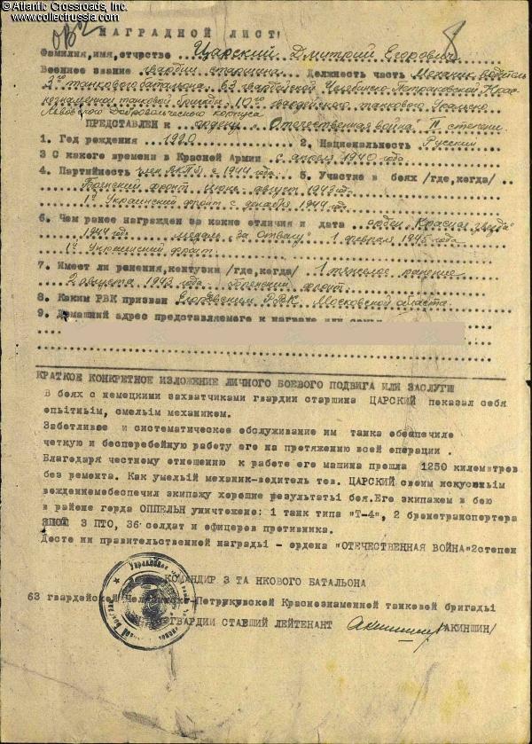 During the Upper Silesian offensive in March 1945, Tsarskiy was cited for excellent maintenance of his tank and great skills as a mechanic- driver. During the campaign, his T-34 had covered 1,250 km (777 miles) without repair. In the fighting for the city of Oppeln (modern-day Opole, Poland), his tank crew neutralized one Panzer IV tank, two armored personnel carriers, destroyed three anti-tank guns, and killed 36 enemy soldiers. For his outstanding service, Tsarskiy was recommended for the Order of the Patriotic War 2nd cl., which was awarded to him on 30 March 1945 by a general order of the 10th Guards Tank Corps.