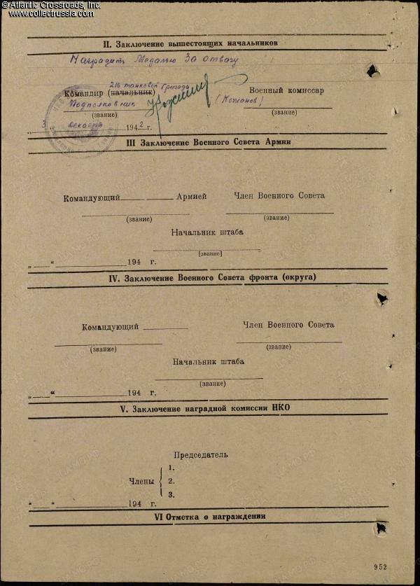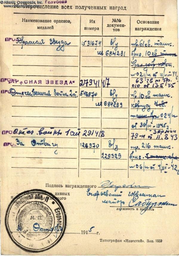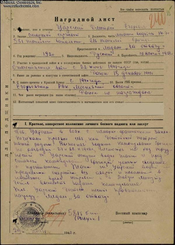 Dmitriy Tsarskiy was born in 1920 in a village of Moscow Region and drafted into the Red Army at 20 years of age, just before the Patriotic War. He was at the front lines from the first day of the war, 22 June 1941, and was wounded in December of that year. In November 1942, Tsarskiy had the rank of Sergeant and served as the driver of a T-70 light tank in the 581st Tank Battalion, 216th Tank Brigade, 5th Tank Army, Southwestern Front, engaged in the Battle of Stalingrad. At that time, the 5th Tank Army was positioned near Serafimovich on the right bank of the Don River, facing the Romanian 3rd Army and ready to attack. Once Operation Uranus, planned by Zhukov and Vasilevskiy, was launched on 19 November 1942, the 5th Tank Army quickly overran the Romanian 3rd Army which was outnumbered, poorly equipped, and stretched too thin. The lightly armed but reliable and swift T-70s were primarily designated for infantry support but were also often used for reconnaissance, and Tsarskiy distinguished himself on recon missions on 27-28 November 1942. In the commendation for the Medal for Valor, he was cited for skillful driving at maximum speed without accidents or needing help, and for bringing important information about the enemy. The medal was awarded to him on 4 December 1942, well before the end of the Battle of Stalingrad.