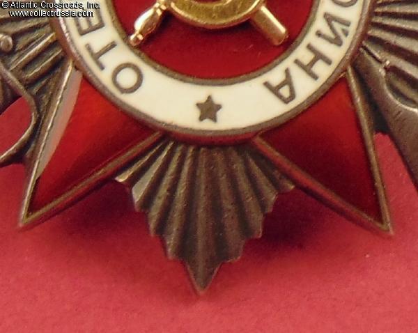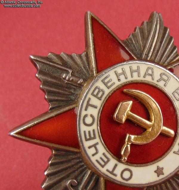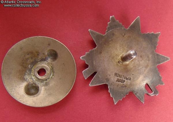 Silver, 14 K gold (hammer and sickle emblem), enamels; measures 46.2 mm tall x 44.1 mm wide; weighs 27.4 g without the screw plate. Features a relatively flat reverse and the mint mark in straight horizontal lines. This piece is from the third series of Krasnokamsk Mint "Flatbacks", manufactured in March 1945 (according to mondvor.narod.ru). In very fine to excellent condition. The enamel appears practically perfect to the unaided eye and retains a beautiful luster. A close examination with a 10x loupe reveals a single miniscule flake at the base of the 5 o'clock arm and some microscopic contact marks to the arms throughout but no significant wear. There is a very attractive even patina to silver on both sides. The screw post is full length, nearly 13 mm, and includes an original WW2-era screw plate.