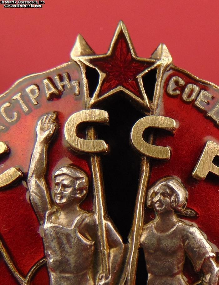 In excellent condition, absolutely outstanding for a wartime issue. The enamel is completely flawless, free of any wear or even the tiniest contact marks that could be found under a 10x loupe. The original gilt on the letters "CCCP" is clearly visible. The figures of the workers have only a couple of microscopic contact mar