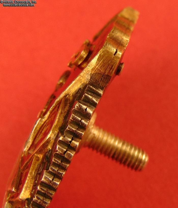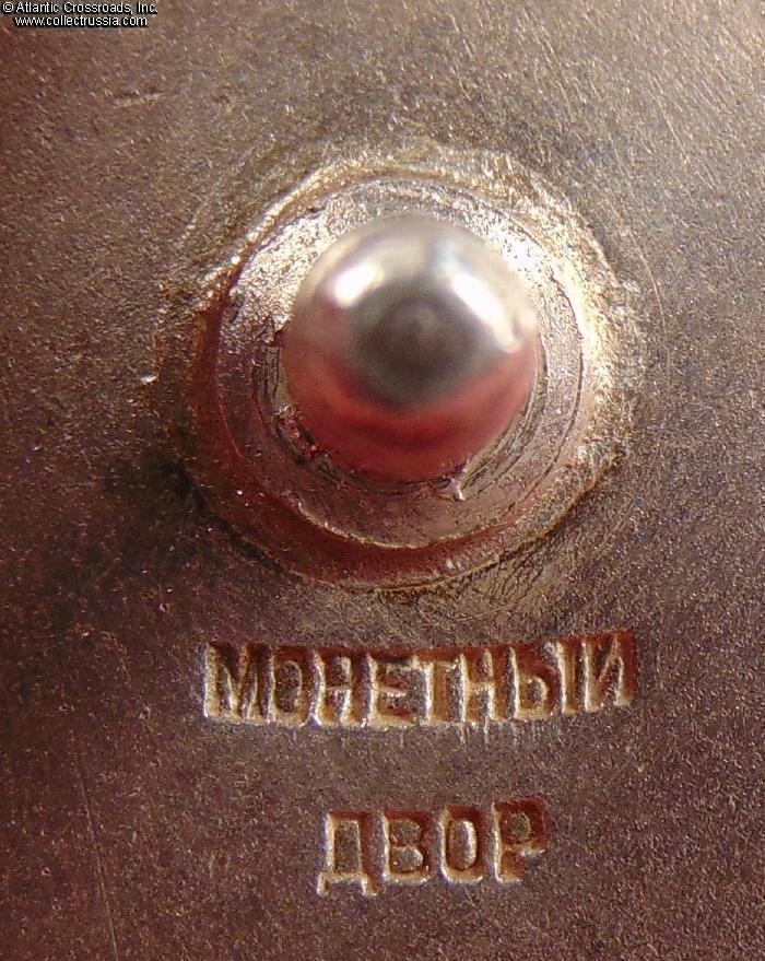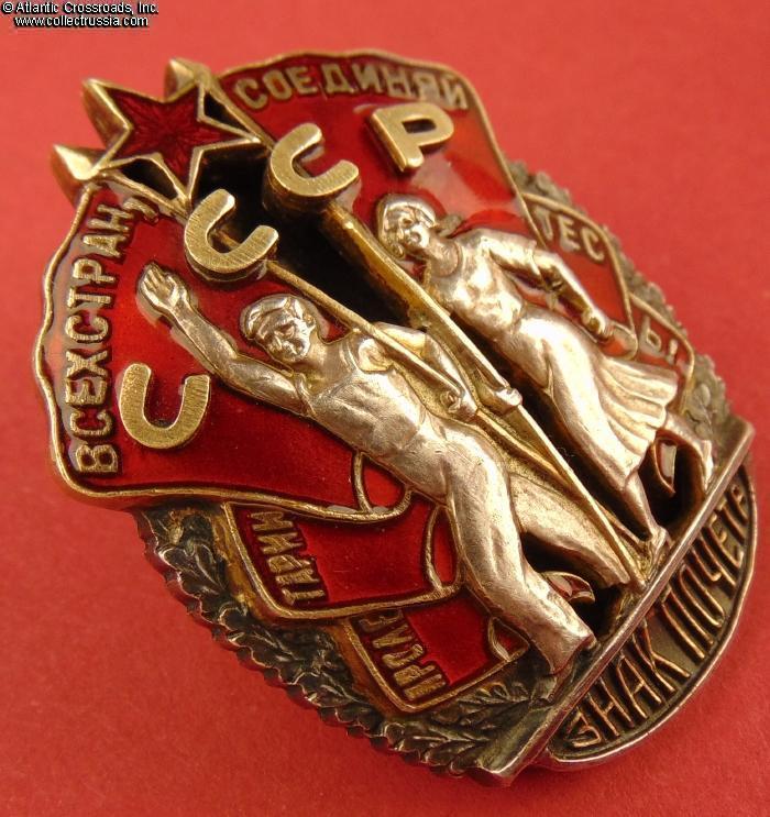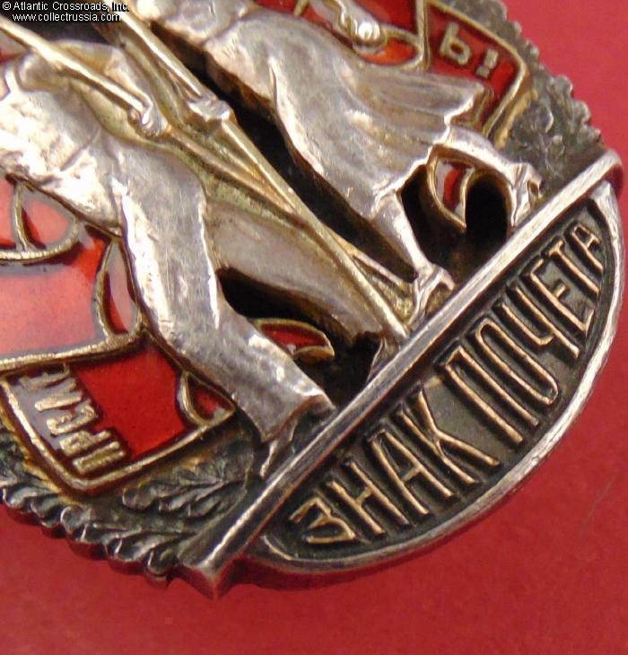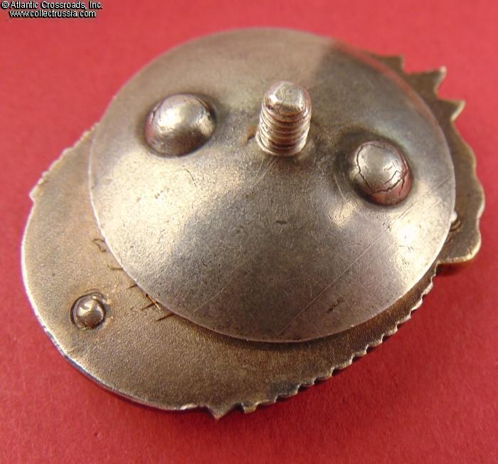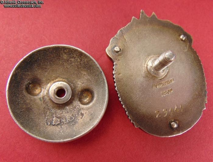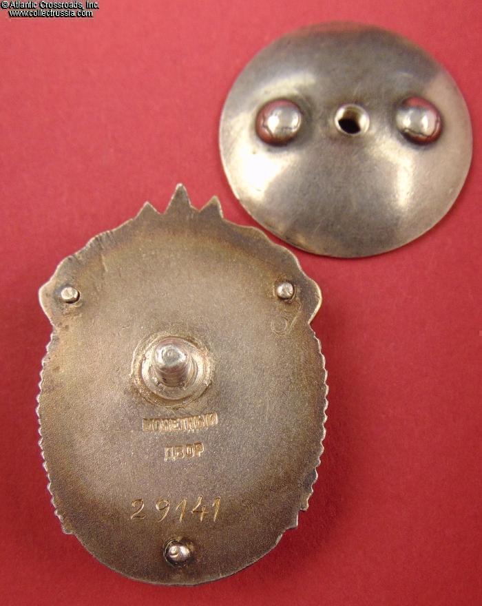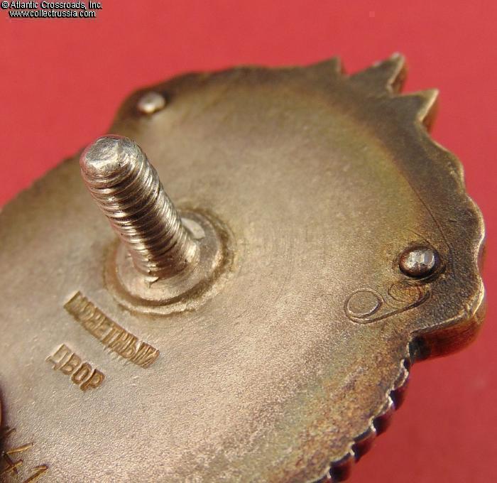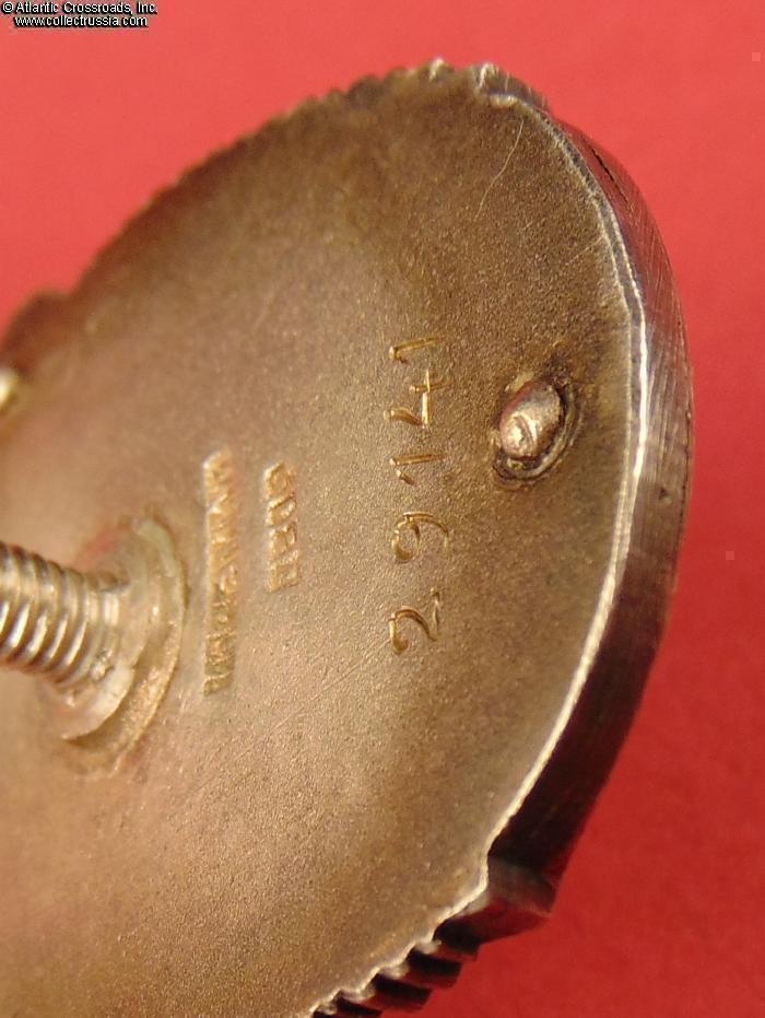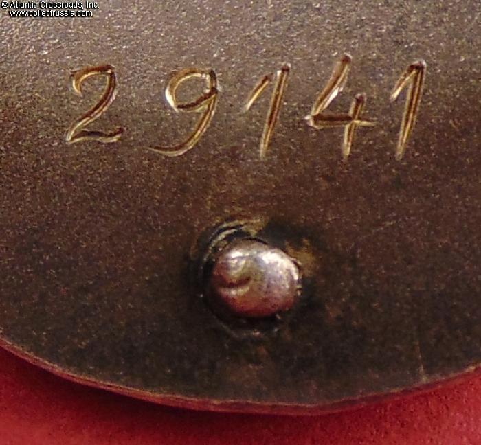 In excellent condition, absolutely outstanding for a wartime issue. The enamel is completely flawless, free of any wear or even the tiniest contact marks that could be found under a 10x loupe. The original gilt on the letters "CCCP" is clearly visible. The figures of the workers have only a couple of microscopic contact marks that are completely unnoticeable to the naked eye; their raised details are perfect and exceptionally crisp. The reverse shows a very attractive toning; note that the silver gets progressively darker closer to the edges where it was not covered by the screw plate. The rivets are intact and tight. The screw post is full length, well over 10 mm long measured from its base. An original WW2-era silver screw plate is included.