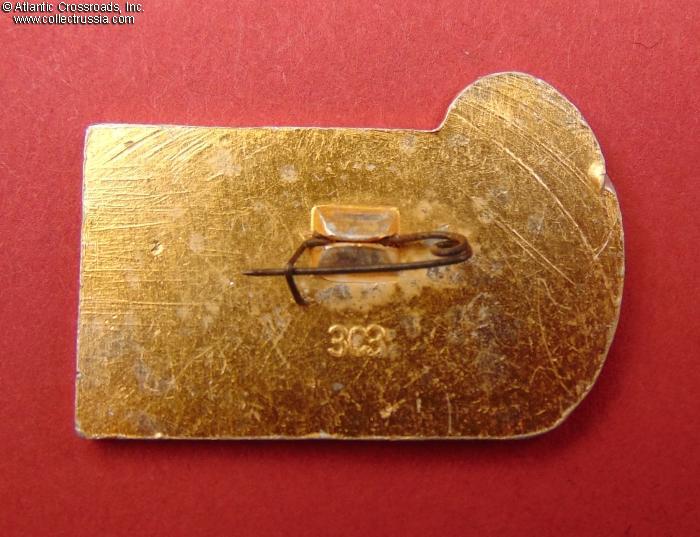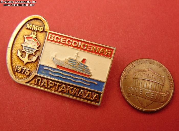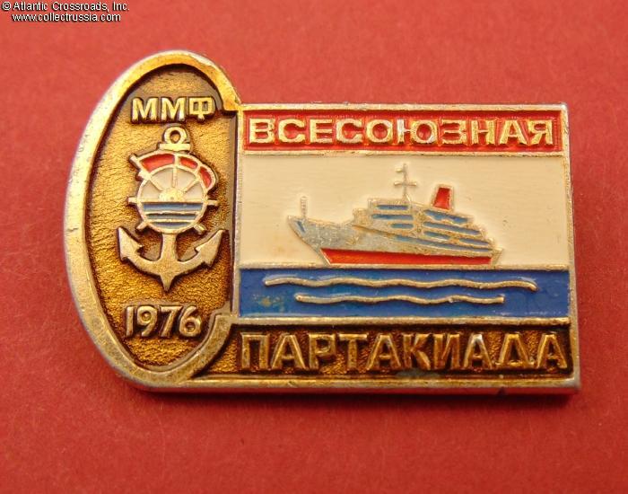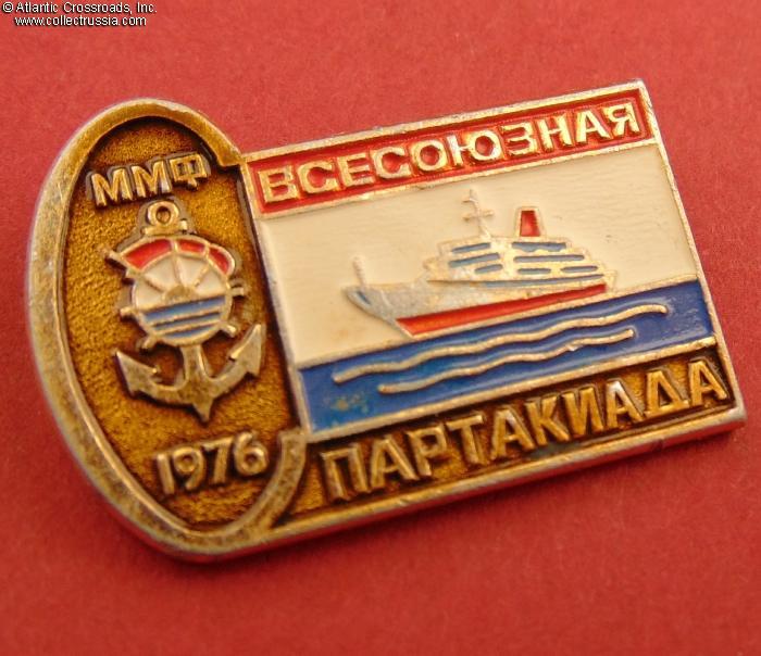 Anodized aluminum, paint, lacquer; 23.8 x 35.2 mm. On the left size is the emblem of the sports club of sailors, a 1976 date of the event, and inscription "MMF" (Ministry of Merchant Fleet). The reverse shows the logo ЗСЗ ("ZSZ") of the Moscow Sports Badges Factory. An attractive badge in excellent condition.