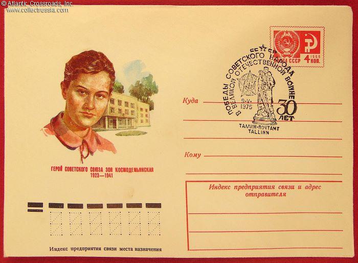The size is 6 ½" x 4 ½", with a pre-printed postal stamp. Postally unused, published by the Ministry of Communications of the USSR, circulation unknown. The stamp is canceled with the First Day Cover issued by the Tallinn (Estonian SSR) Post Office, dated 9 May 1975, in celebration of the 30th anniversary of victory in the Patriotic War of 1941-1945. The artwork in the left obverse pane shows a portrait of Zoya Kosmodemyanskaya, the first woman - Hero of the Soviet Union. Serving in the Red Army in a reconnaissance group specializing in subversive activity behind enemy lines, she was tasked in November 1941 with setting fire to several villages from which the Red Army had retreated, to deprive German troops from a place to rest. Needless to say, those villages still had their Soviet population in place. With or without the help from the peasants whose houses Zoya set fire to, she was captured by the Nazis, tortured and executed.