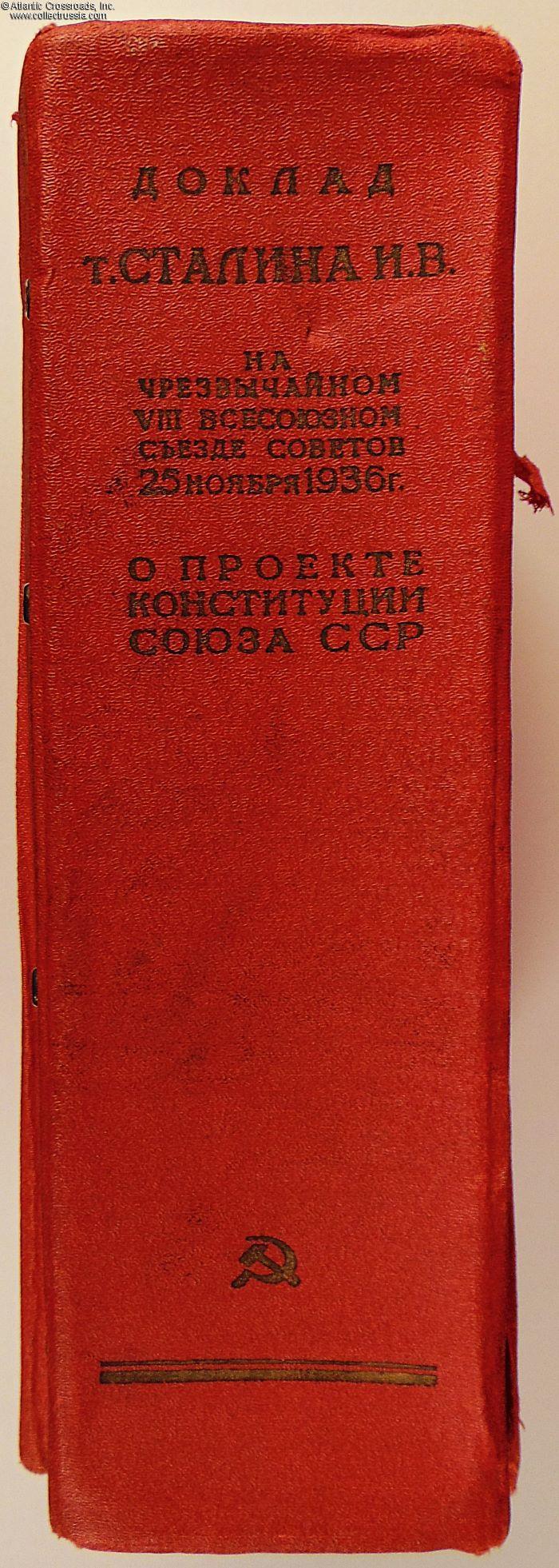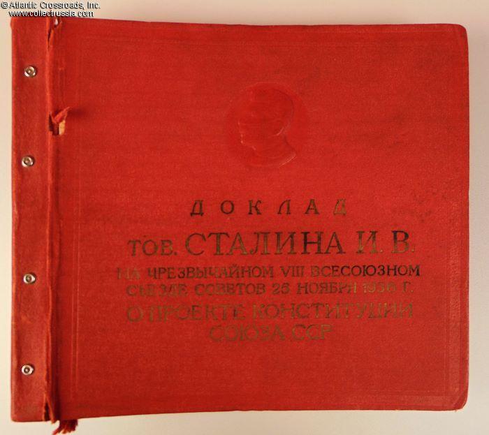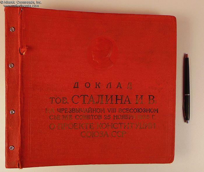 Large format measuring approx. 12" x 11" x 3", contains 21 sleeves for 78-rpm records. In oilcloth-wrapped hard cover, with Stalin's profile embossed on the front cover over the title of the set, "Report of Comrade Stalin I.V. at the extraordinary VIII All-Union Congress of the Soviets 25 November 1936. On the Project of the Constitution of the Union of SSR." The same lettering is seen on the spine. A set like this was most likely meant for distribution among local communist party organizations to