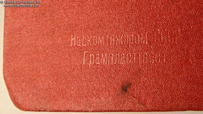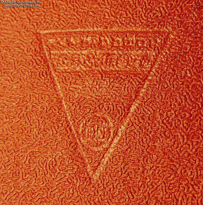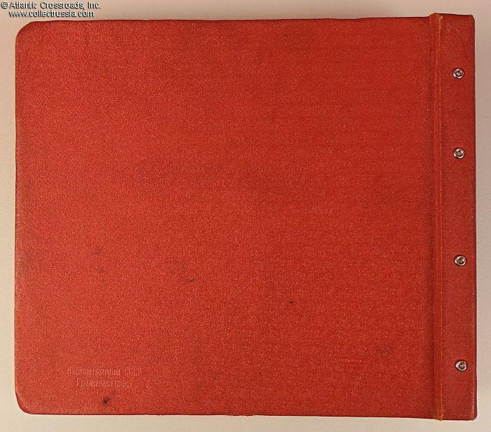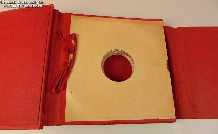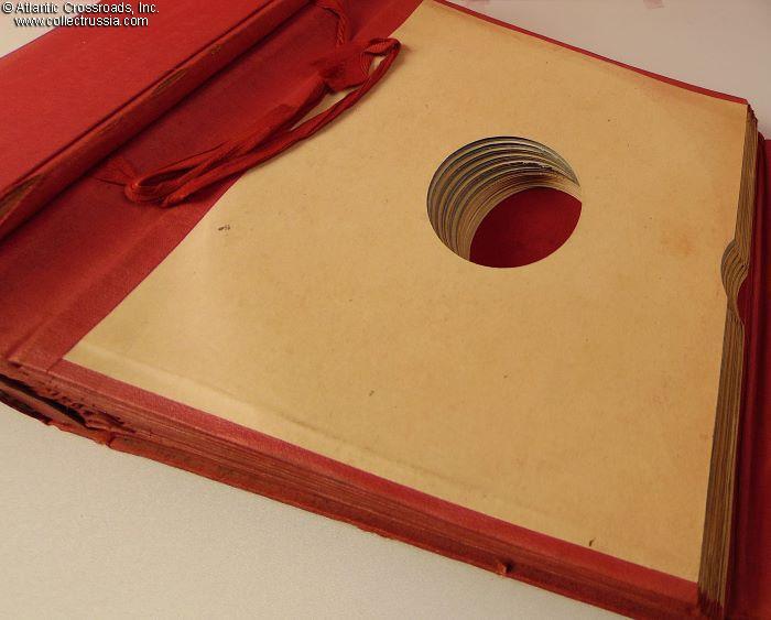 In very good condition. Sturdily made to accommodate the weight of 21 shellac records, only the front cover shows moderate wear to the oilcloth holding it attached to the spine. Otherwise, there are a couple of small bumps to the edges where cardboard shows through the holes. The lettering, embossed on the front cover and finished in bronze paint, has lost most of its bronze luster but the paint is still in place, and the lettering is clear and perfectly legible. The bottom left-hand corner of the back cover is stamped with the manufacturer's mark, НАРКОМТЯЖПРОМ СССР, Russian acronym for People's Commissariat of Heavy Machine Industry of the USSR.