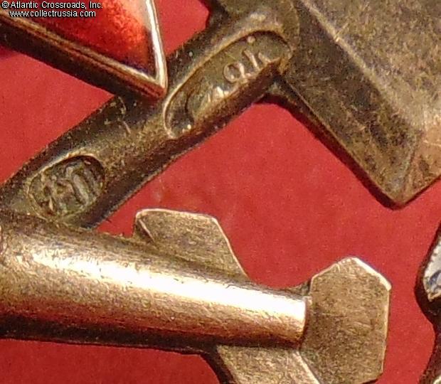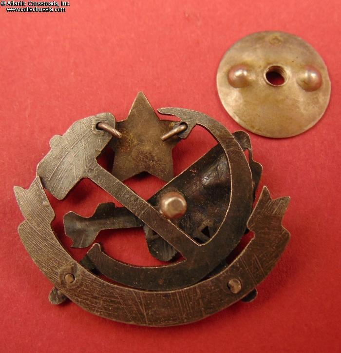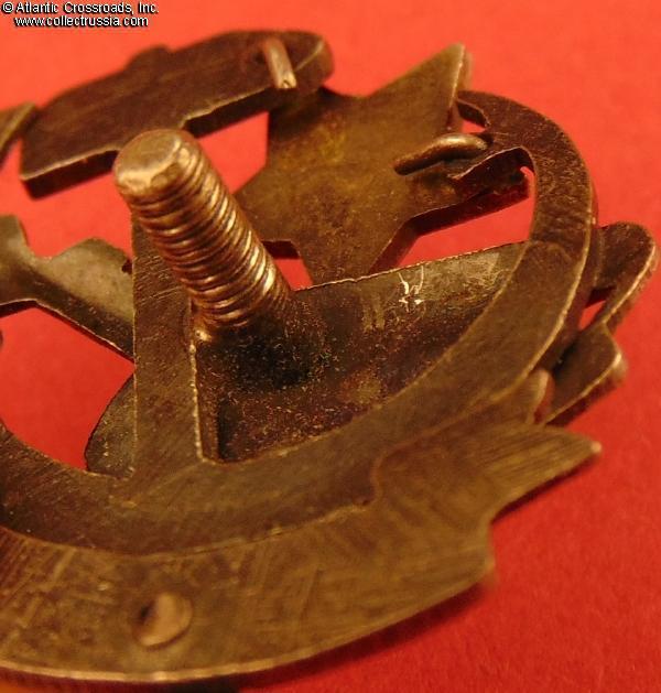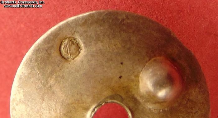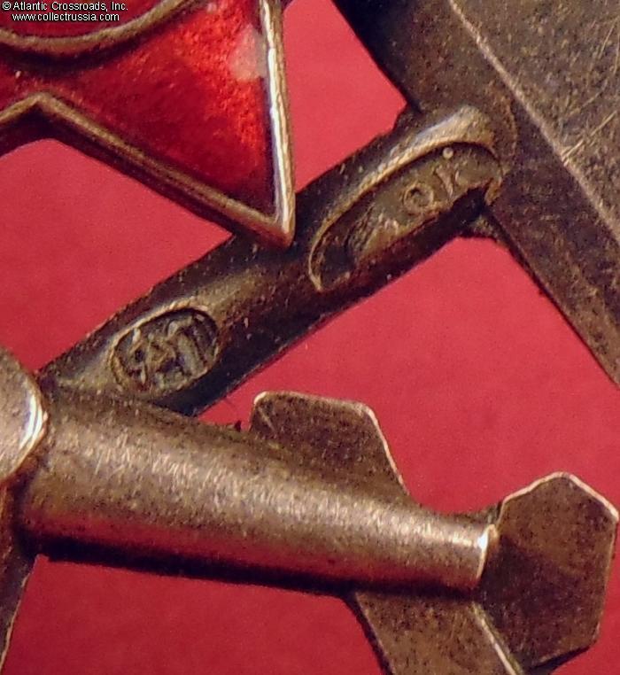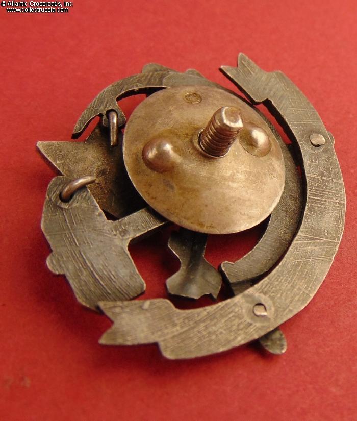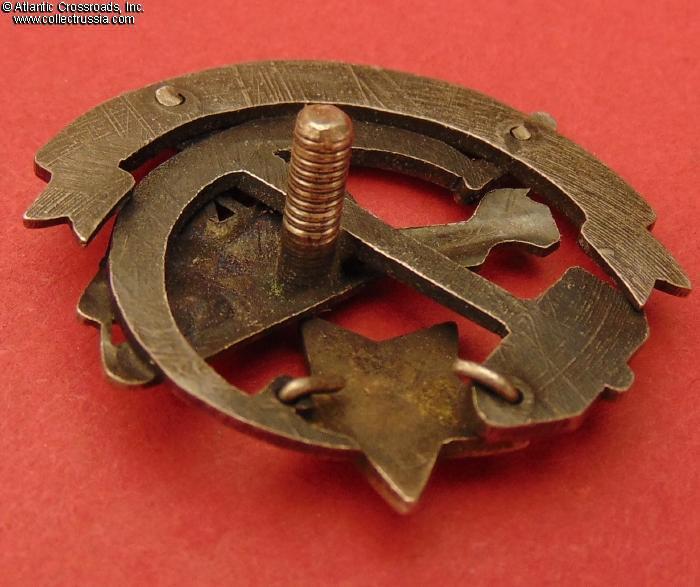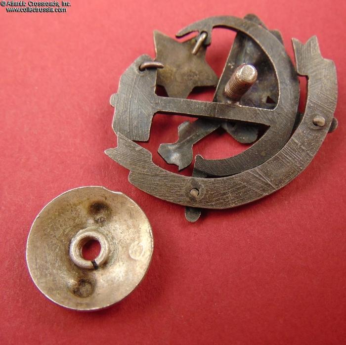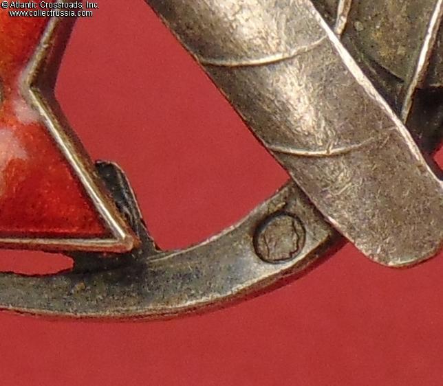 Silver, enamels. Measures 31.3 mm in height, 36.4 mm in width; weighs 10.6 g without the screw plate, 12.0 g overall. Extremely elegant design and fine workmanship, riveted multi-piece construction. This is the second, 1924- 25 version of the Northwestern ODVF badge featuring the letters "CCCP" (USSR) inside the red star. The obverse shows an imperial-style "Kokoshnik" silver hallmark (used only until 1926) on the upper portion of the sickle. The handle of the hammer has an "84" silver assay mark with the "Kokoshnik" and Greek character Alpha, a designation of the Leningrad (fo
