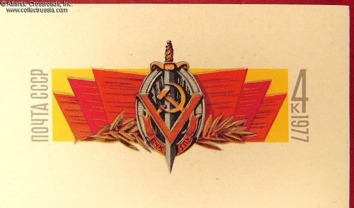 The size is continental standard 6" x 4", postally unused, published by the Ministry of Communications of the USSR, circulation unknown. The obverse features a colorful special edition government postal stamp with the artist's rendition of the Badge of Honored Employee of State Security. The artwork in the left pane of the obverse shows Dzerzhinsky's portrait and the years of his life.