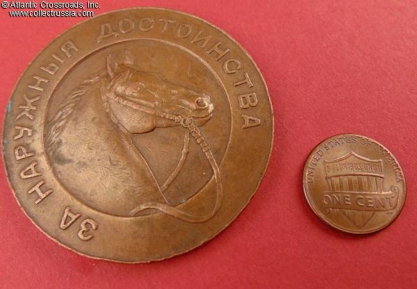 In bronze, 51.0 mm wide; weighs 56.3 g. Unsigned but the engraver is known to be A. Griliches Jr. The obverse has a nicely detailed image of a bridled horse and raised inscription "For Superior Appearance". The inscription on the reverse is "Imperial St. Petersburg Society of Trotter Racing".
