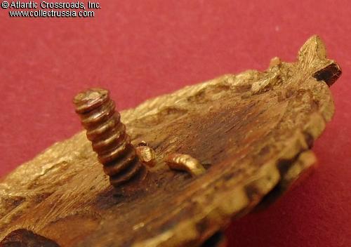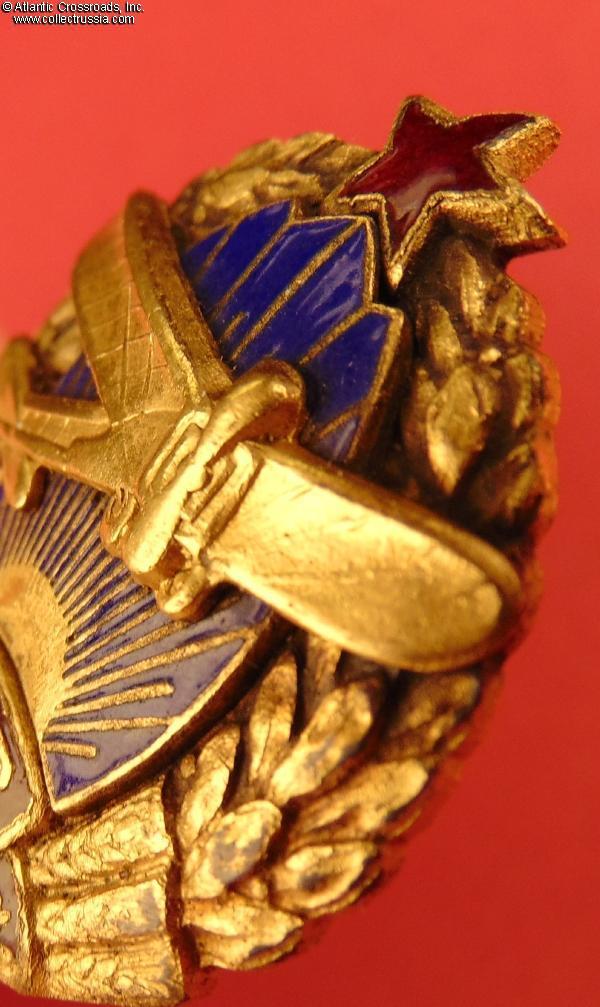 In outstanding, excellent condition, extraordinary for any Soviet badge from the 1920s. The enamel is completely free of any wear visible even under a 10x magnification and exhibits a magnificent luster throughout. The gilt finish is beautifully preserved and bright, especially on the obverse. The details of the artwork are literally pristine.