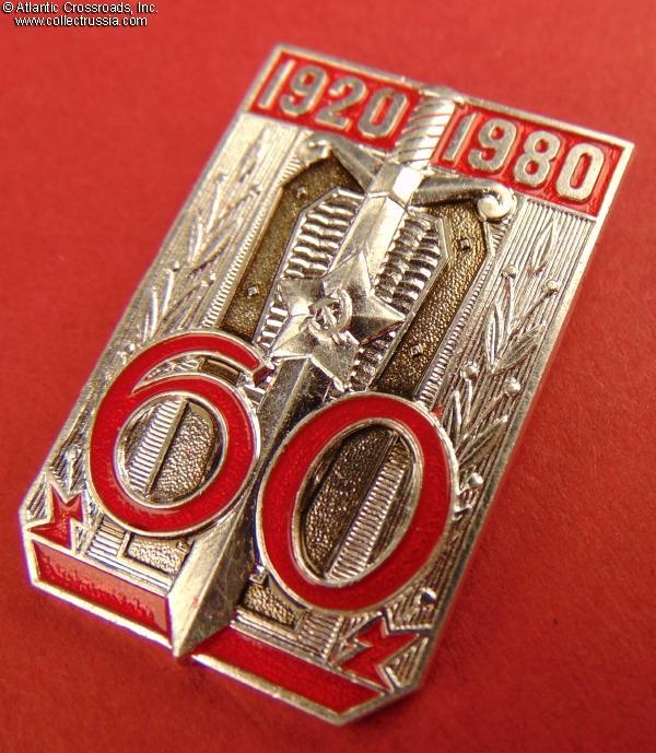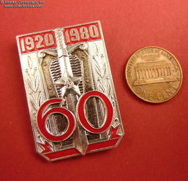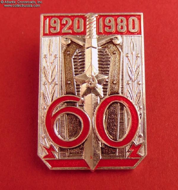Aluminum, paint, lacquer, measures 39.0 x 25.8 mm. Note that the badge shows the dates "1920-1980" and the traditional shield and sword emblem of the Soviet state security but doesn't mention the service or event it commemorates! The reverse has a raised "MMD" logo of the Moscow Mint. Excellent, near mint condition.